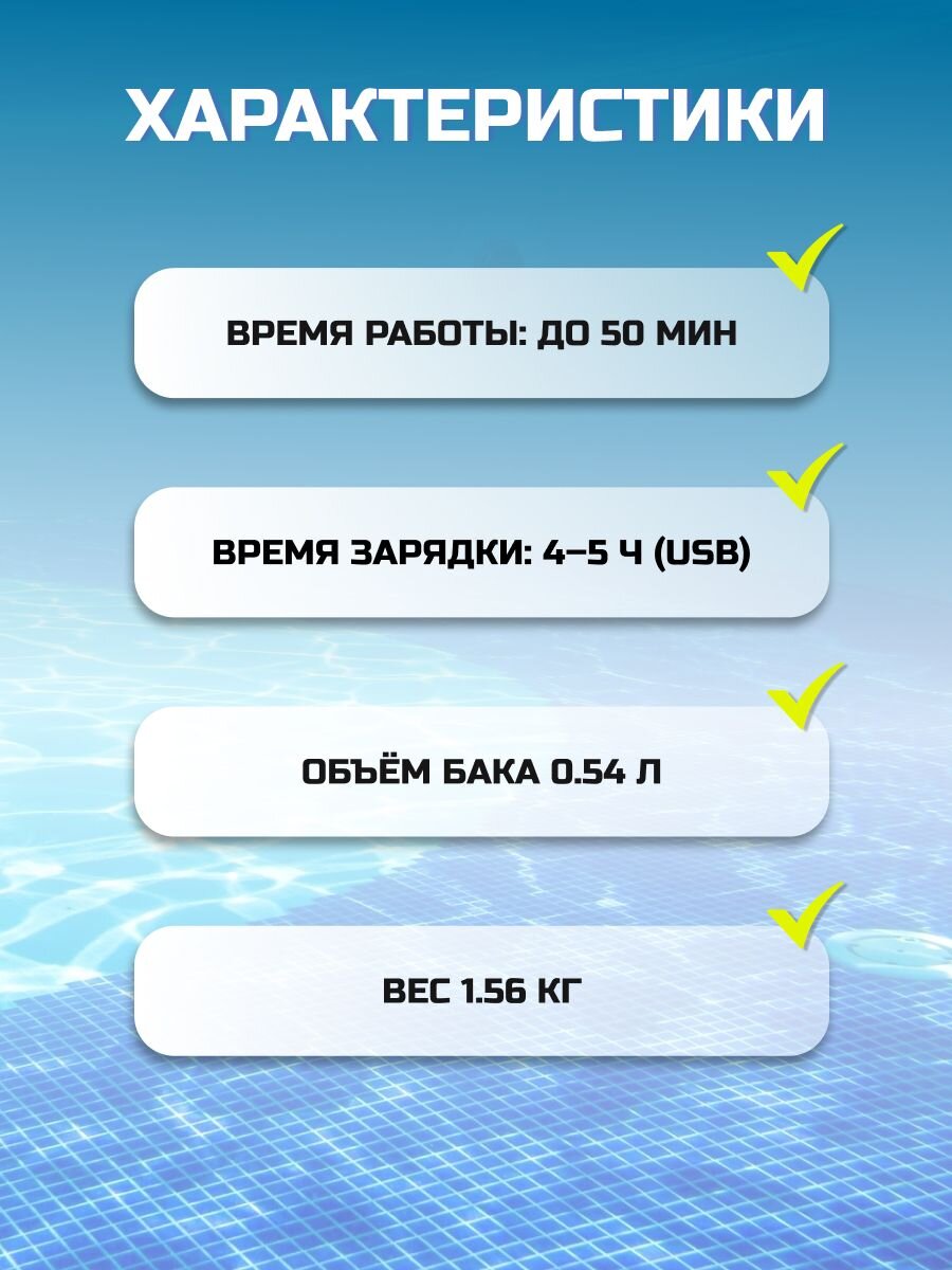Аккумуляторный пылесос Bestway Aqua Sweeper разработан специально для бассейнов диаметром до 610 см. С его помощью можно легко поддерживать чистоту в воде, не затрачивая много времени и усилий. Пылесос оснащен мощным аккумулятором, обеспечивающим до 50 минут автономной работы, что позволяет тщательно очистить бассейн за один раз. Время зарядки составляет всего 4-5 часов с помощью удобного USB-кабеля, что делает его еще более практичным в использовании.