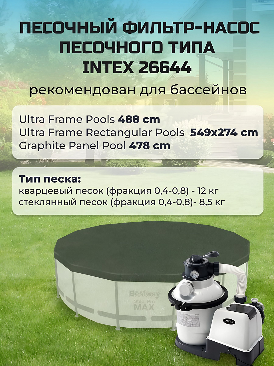 - Универсальность: подходит для бассейнов разных форм и размеров, начиная с диаметра 478 см.