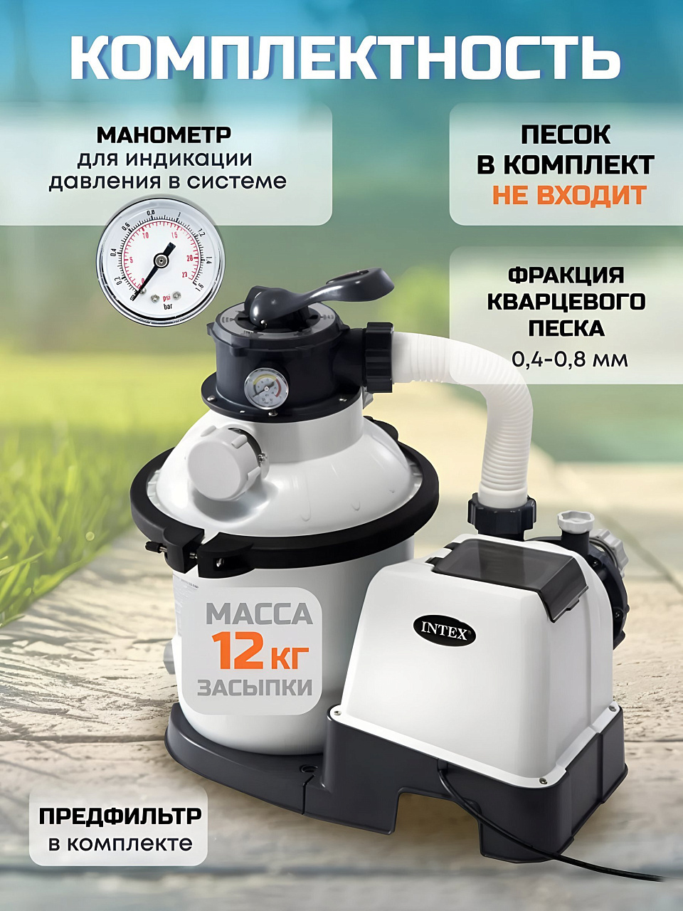 Фильтр-насос изготовлен из высококачественных материалов, что гарантирует его долговечность и надежность. Он поставляется без песка, что дает возможность выбора подходящего типа песка для ваших нужд. Вы можете использовать кварцевый песок (фракция 0,4-0,8) объемом 12 кг или стеклянный песок (фракция 0,4-0,8) объемом 8,5 кг.