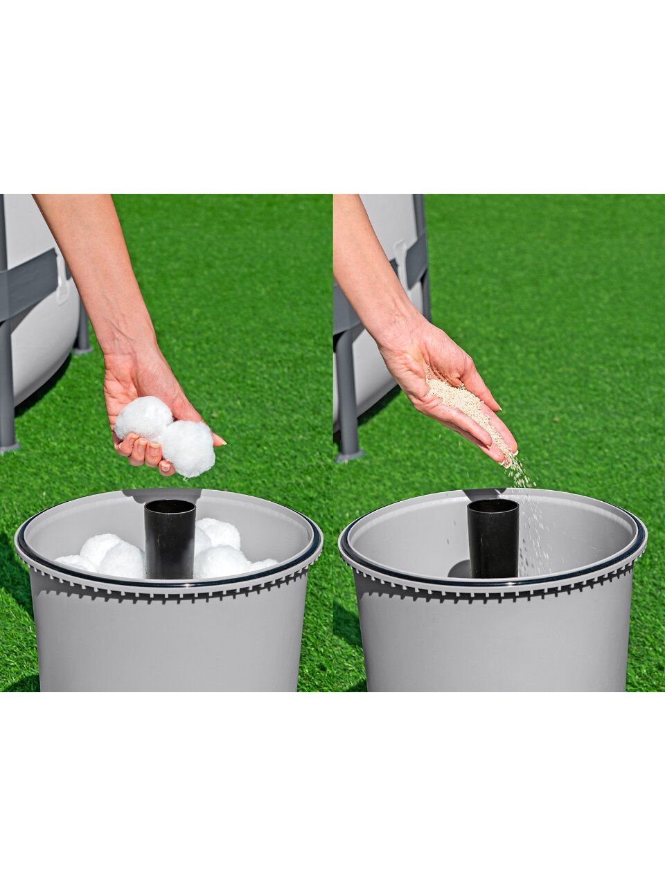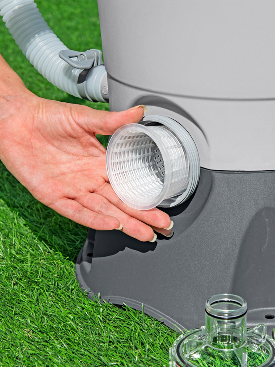 - Контейнер для таблеток: есть (крепится на внутреннюю часть чаши бассейна, к отверстию для поступления воды из фильтра).