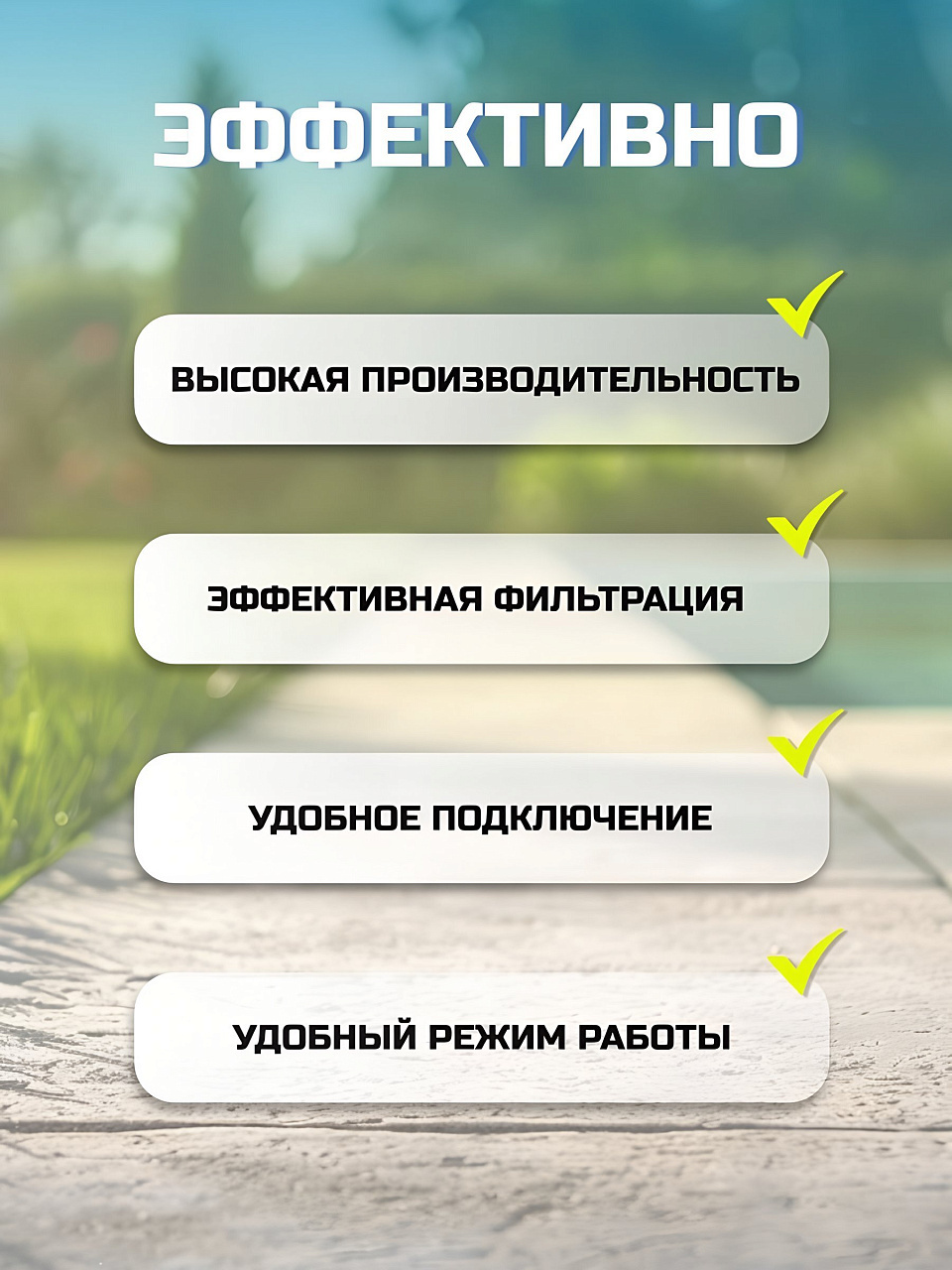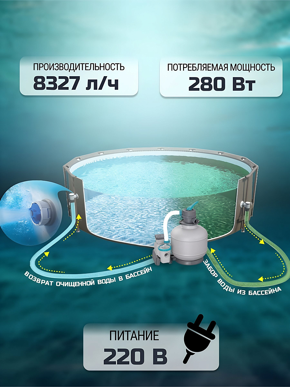 - Высокая производительность: обеспечивает скорость потока воды в бассейне до 8327 л/ч.