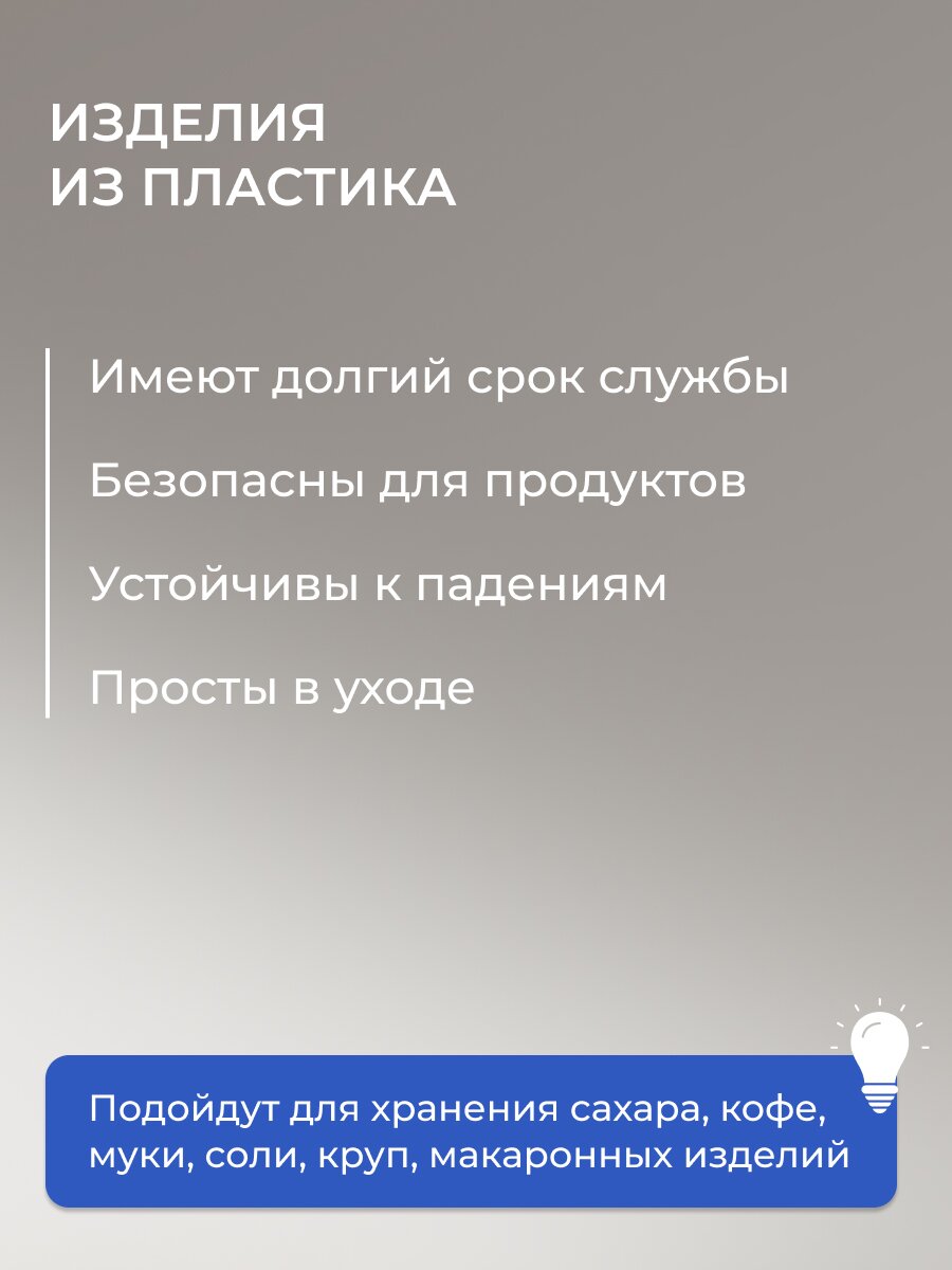 Предназначены для хранения различных сыпучих продуктов: сахара, кофе, муки, соли, круп, макаронных изделий, печенье и многого другого.