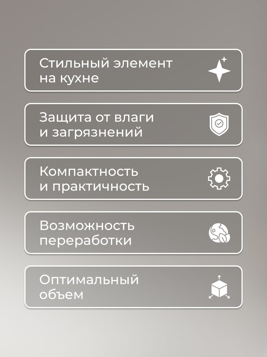 Изделия имеют прозрачный корпус и крышку. Поэтому всегда видно содержимое и его количество, не важно где стоят ёмкости, в выдвижном или навесном ящике.