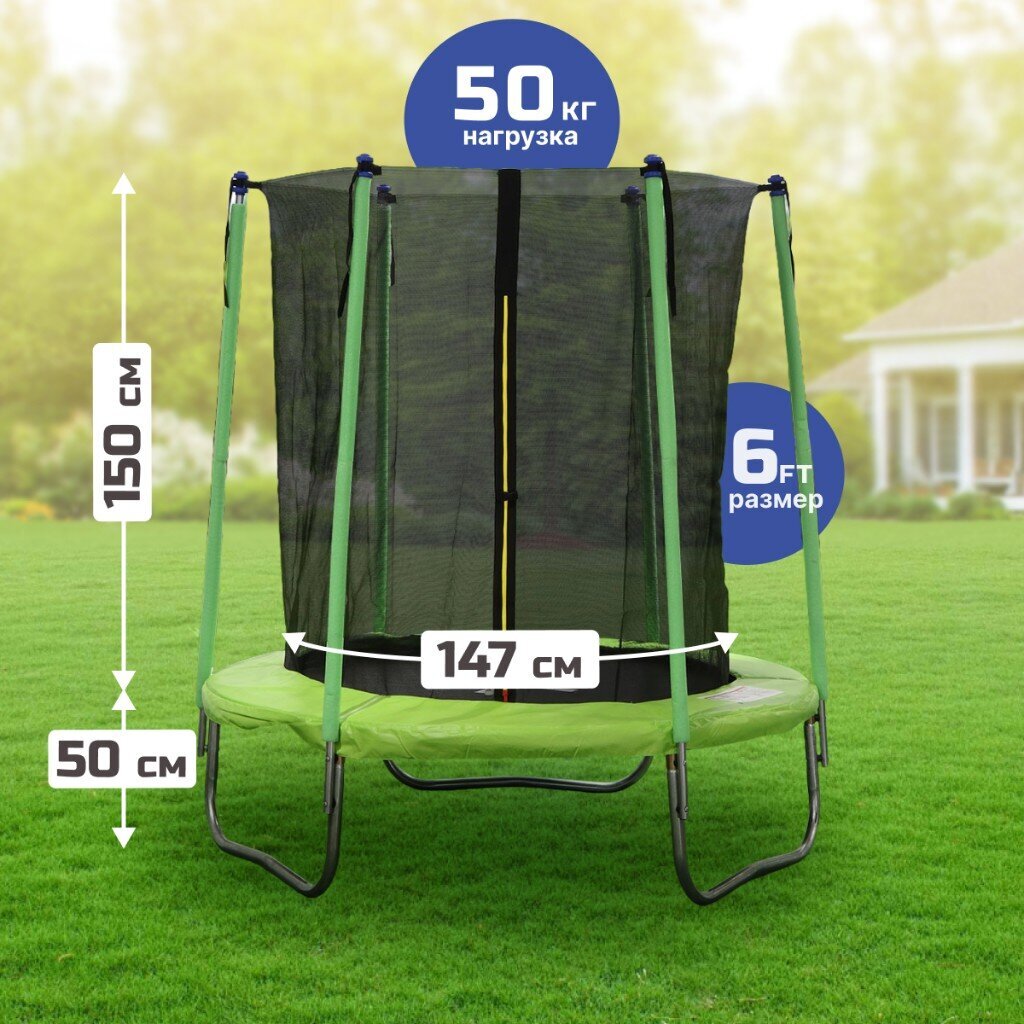- Безопасность: защитная внутренняя сеть исключает падение с высоты, 3-слойный мат - соприкосновение с пружинным механизмом, двойная молния с фиксатором входа.