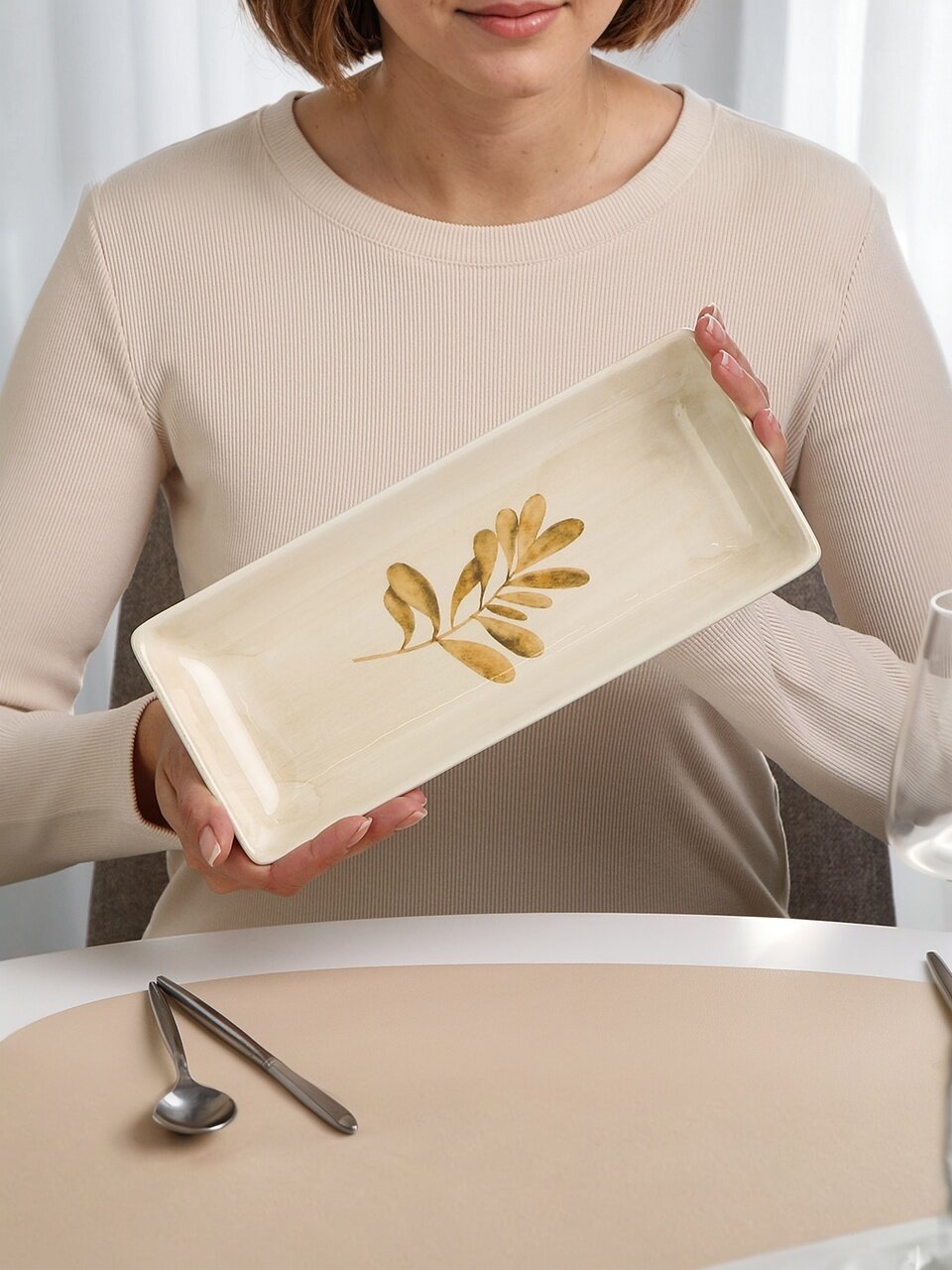 Размер 28×12 см, форма прямоугольная, с бортиками. Цвет бежевый с рисунком, количество в наборе — 1 шт.