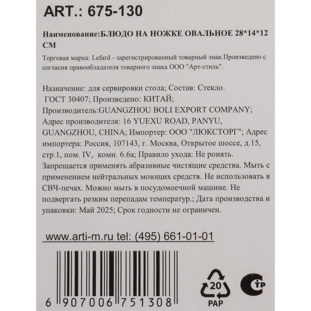 Вы можете приобрести «Блюдо стекло, овальное, 14х28х12 см, на ножке, Lefard, 675-130» и другие товары в нашем интернет-магазине в Таганроге по низким ценам и с бесплатным самовывозом.