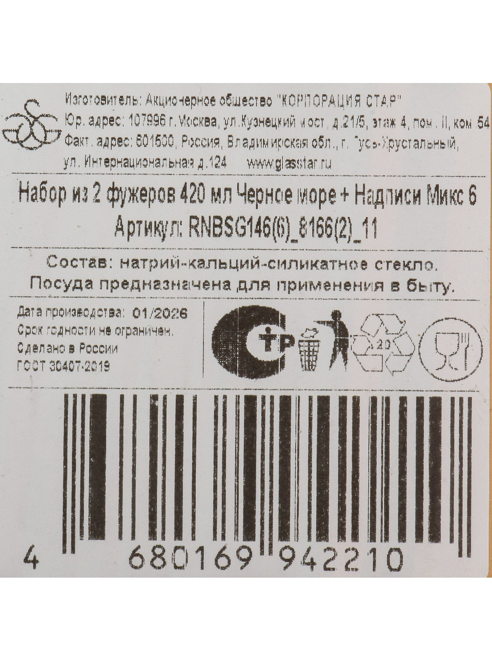 Вы можете приобрести «Бокал для вина, 420 мл, стекло, 2 шт, Glasstar, Черное Море+Надписи Микс, RNBSG8166» и другие товары в нашем интернет-магазине в Тамбове по низким ценам и с бесплатным самовывозом.