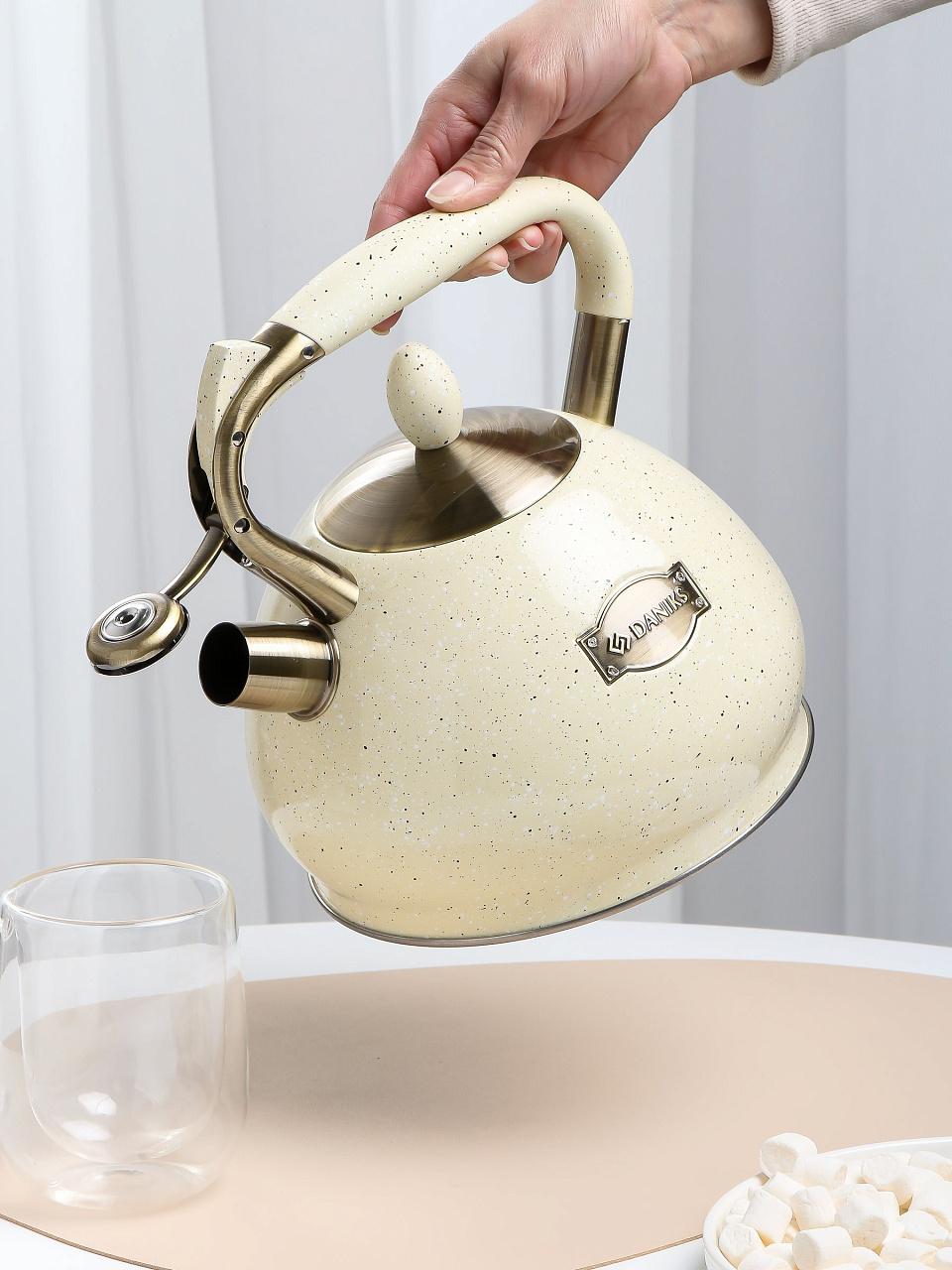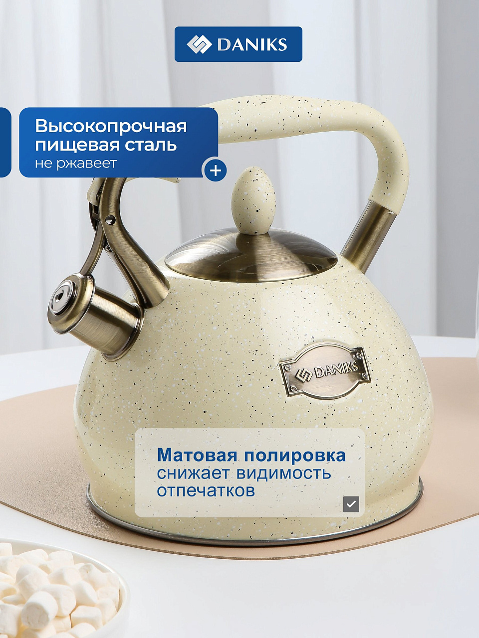 Многие спрашивают: чем отличается этот чайник от эмалированных моделей? Во-первых, нержавеющая сталь долговечнее и проще в уходе — можно мыть в посудомоечной машине. Во-вторых, свисток своевременно подскажет, когда вода закипела, что особенно удобно для занятых людей. Актуальные вопросы: как использовать чайник на индукции и подходит ли для дачи — отвечаем: да, данная модель совместима со всеми типами плит и отлично впишется в любой интерьер благодаря универсальному бежевому цвету.