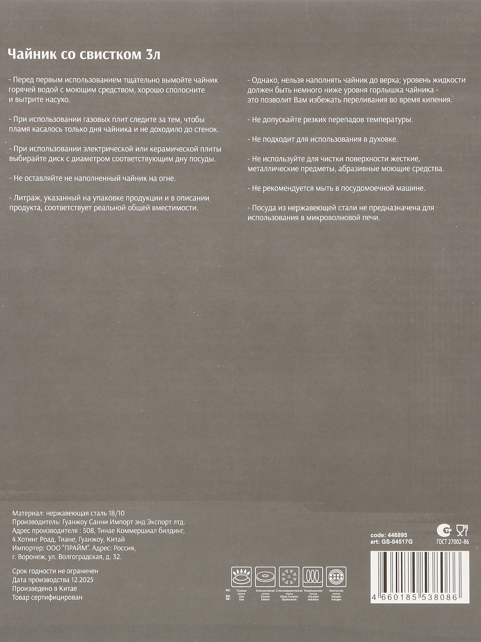 Объем чайника — 3 литра. Это оптимальный вариант для семьи из 3-5 человек или для дружеских посиделок. Благодаря большому объему можно быстро вскипятить воду на несколько кружек чая или кофе одновременно.