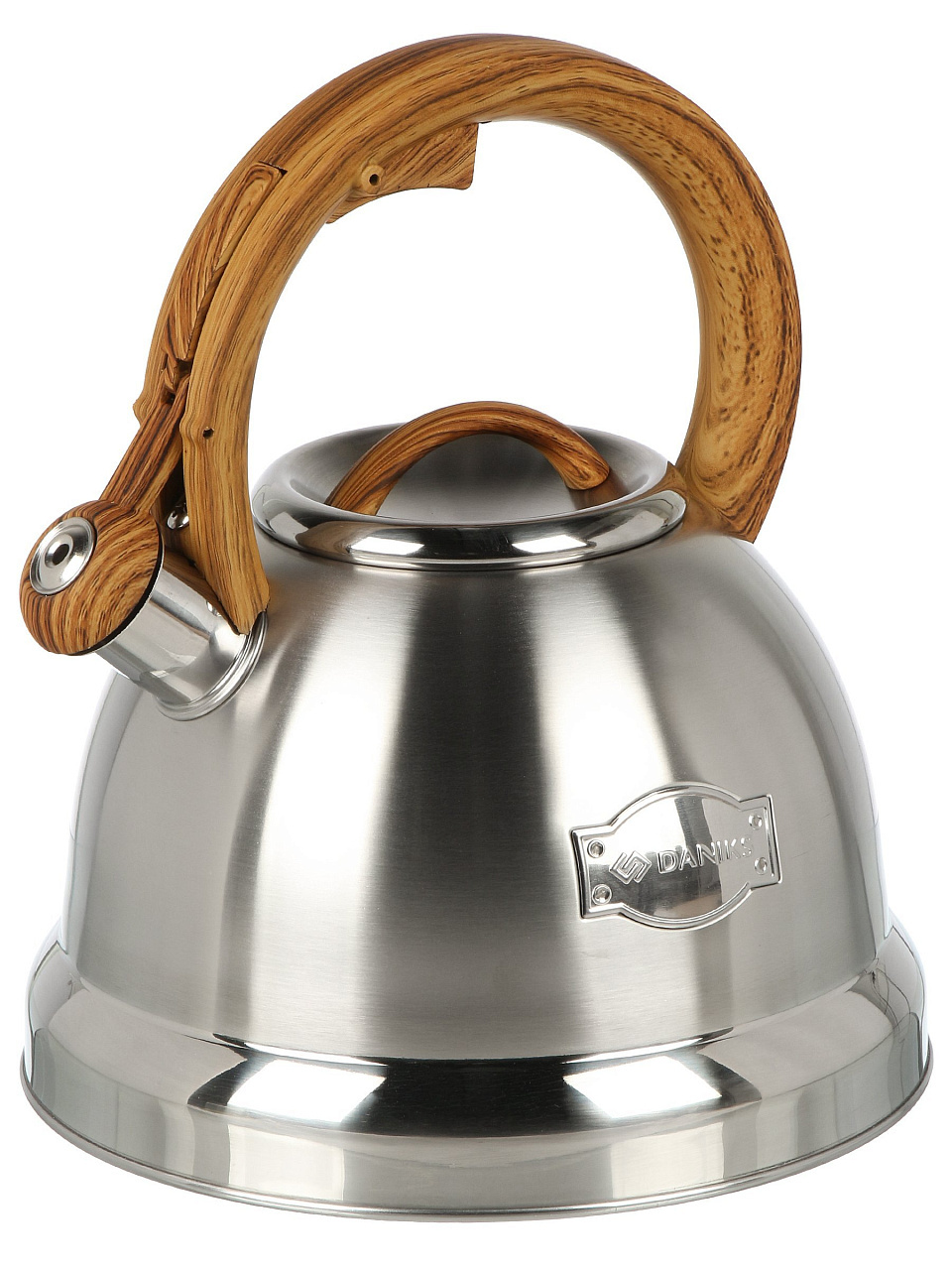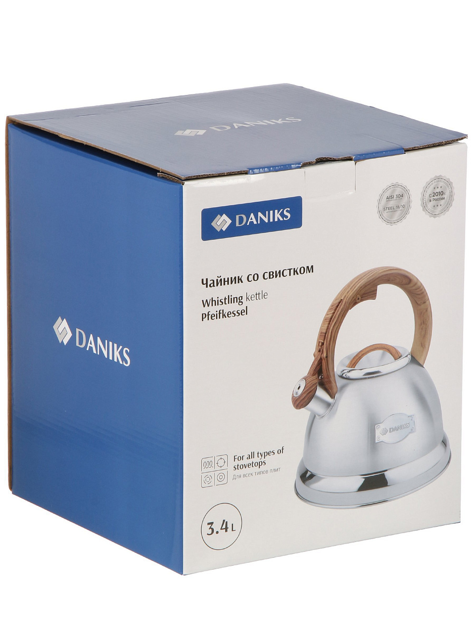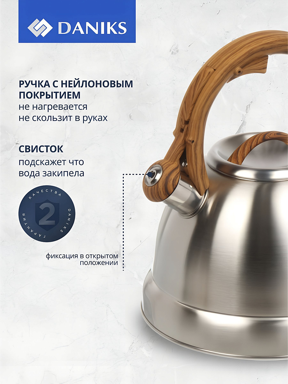 Чайник Daniks 3.4 л из матовой нержавеющей стали: ваш надежный помощник для индукционных плит, со свистком, нейлоновой ручкой и возможностью мытья в посудомоечной машине.