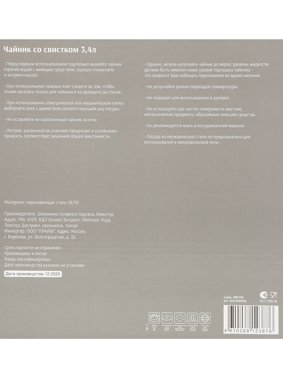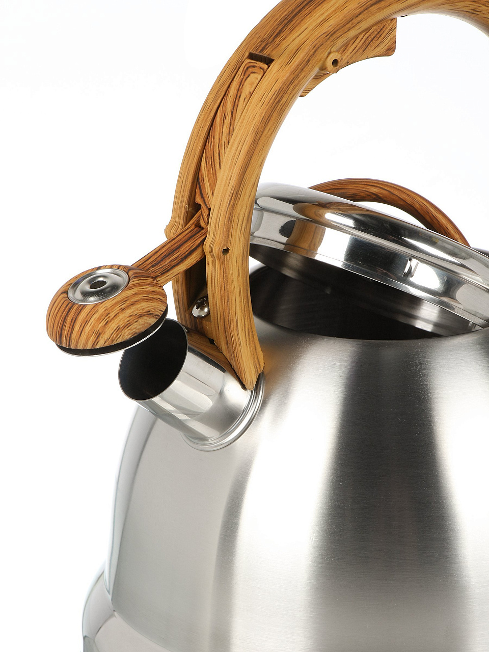 Благодаря объёму 3.4 л и быстрому нагреву на всех типах плит, чайник позволяет за раз вскипятить воду для нескольких человек, а прочная сталь гарантирует долгий срок службы.