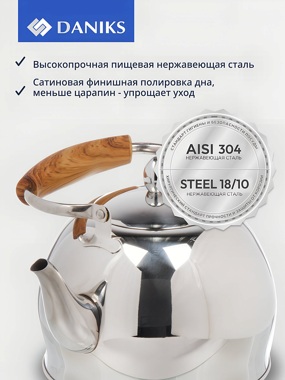 Чайник Daniks из нержавеющей стали — это практичный выбор для тех, кто ищет недорогой, но надежный чайник для индукционной плиты. Благодаря зеркальной полировке корпус смотрится эффектно и легко очищается. Капсульное дно обеспечивает равномерный нагрев воды на всех типах плит, включая индукцию и стеклокерамику. Если вы ищете, какой чайник выбрать для дачи или кухни, обратите внимание на этот вариант: классический дизайн сочетается с функциональностью.