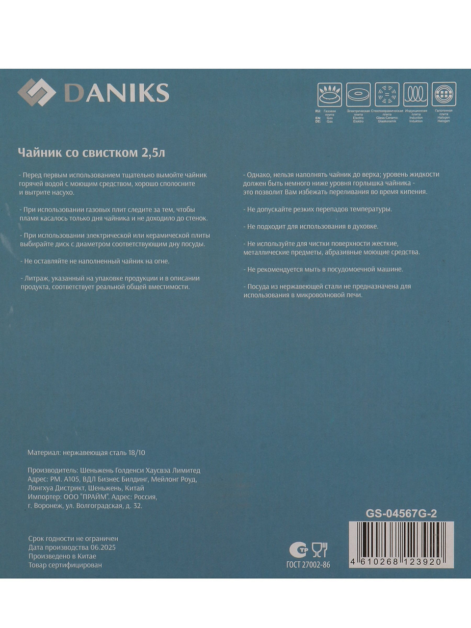 Думаете, как использовать чайник на даче или в городской квартире? Легко: объем 2.5 литра — оптимальный для семьи, а уход не требует усилий — чайник можно мыть в посудомоечной машине. Это выгодно для тех, кто ценит время и комфорт. Выбирайте Daniks GS-04567G-2 — надежный и стильный чайник с гарантией 12 месяцев.