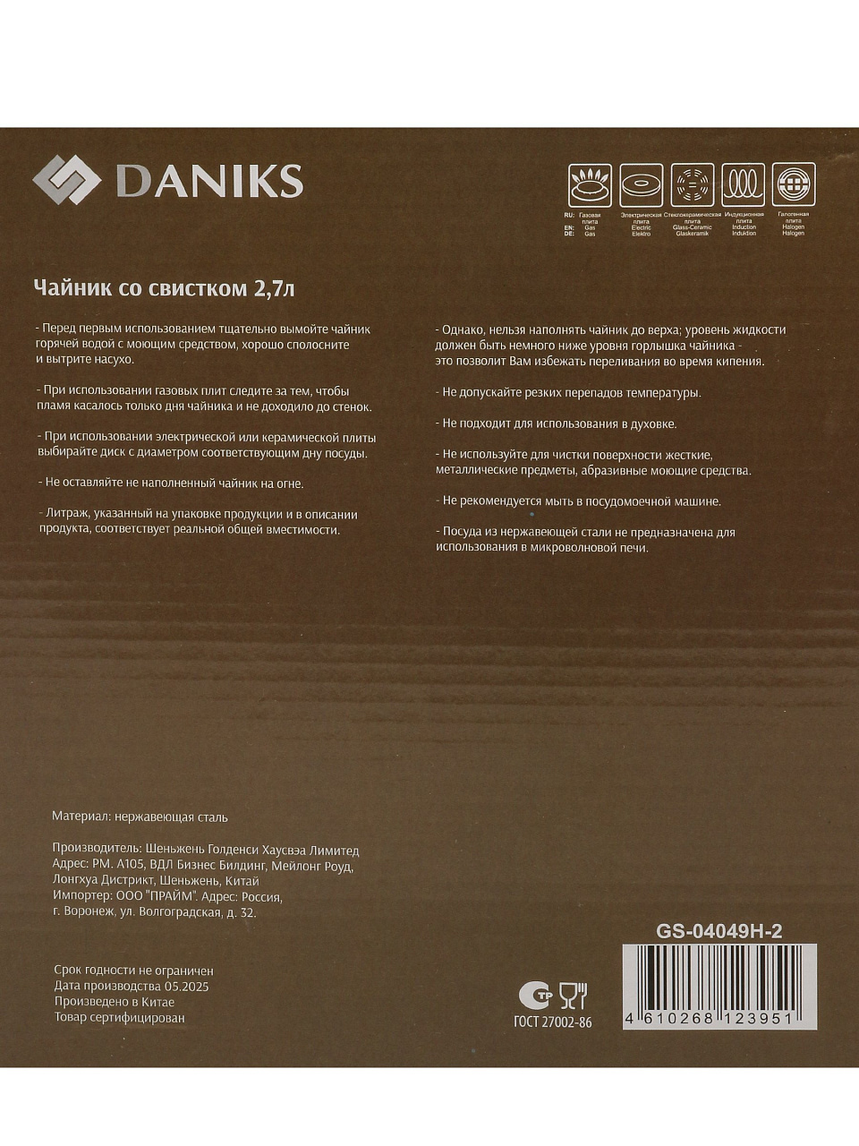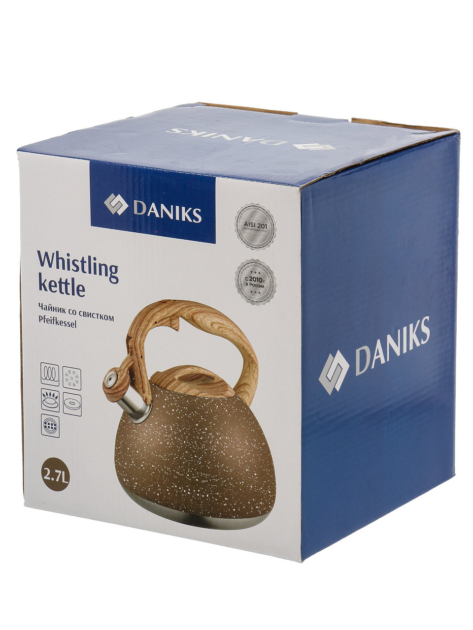 Чайник Daniks 2.7 л из нержавеющей стали со свистком — для дома и дачи, совместим с индукцией, безопасная нейлоновая ручка, выгодная цена.