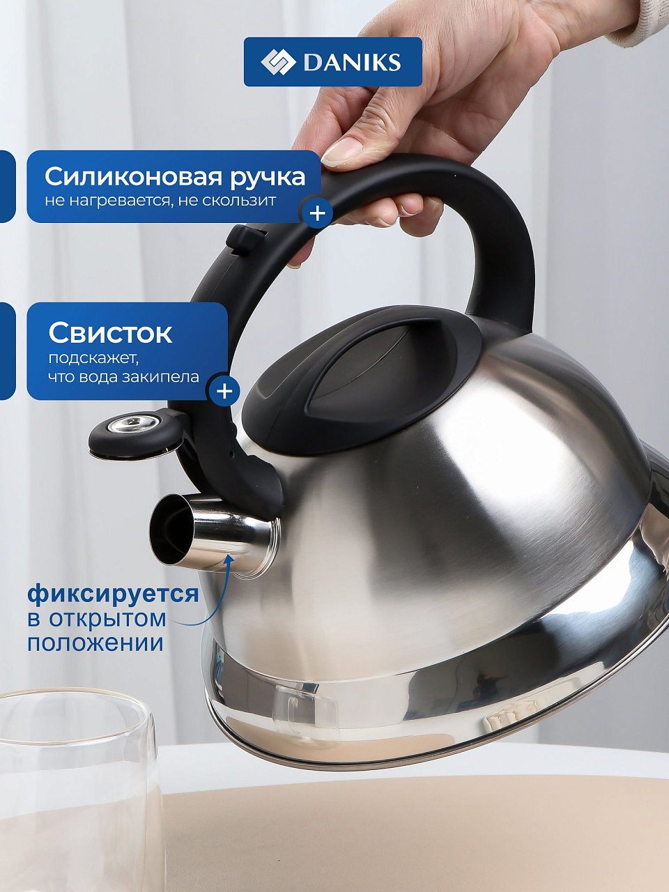Чайник из нержавеющей стали Daniks 2.8 л — оптимальный выбор для дома и дачи: надежная конструкция, безопасная силиконовая ручка и выгодная цена.