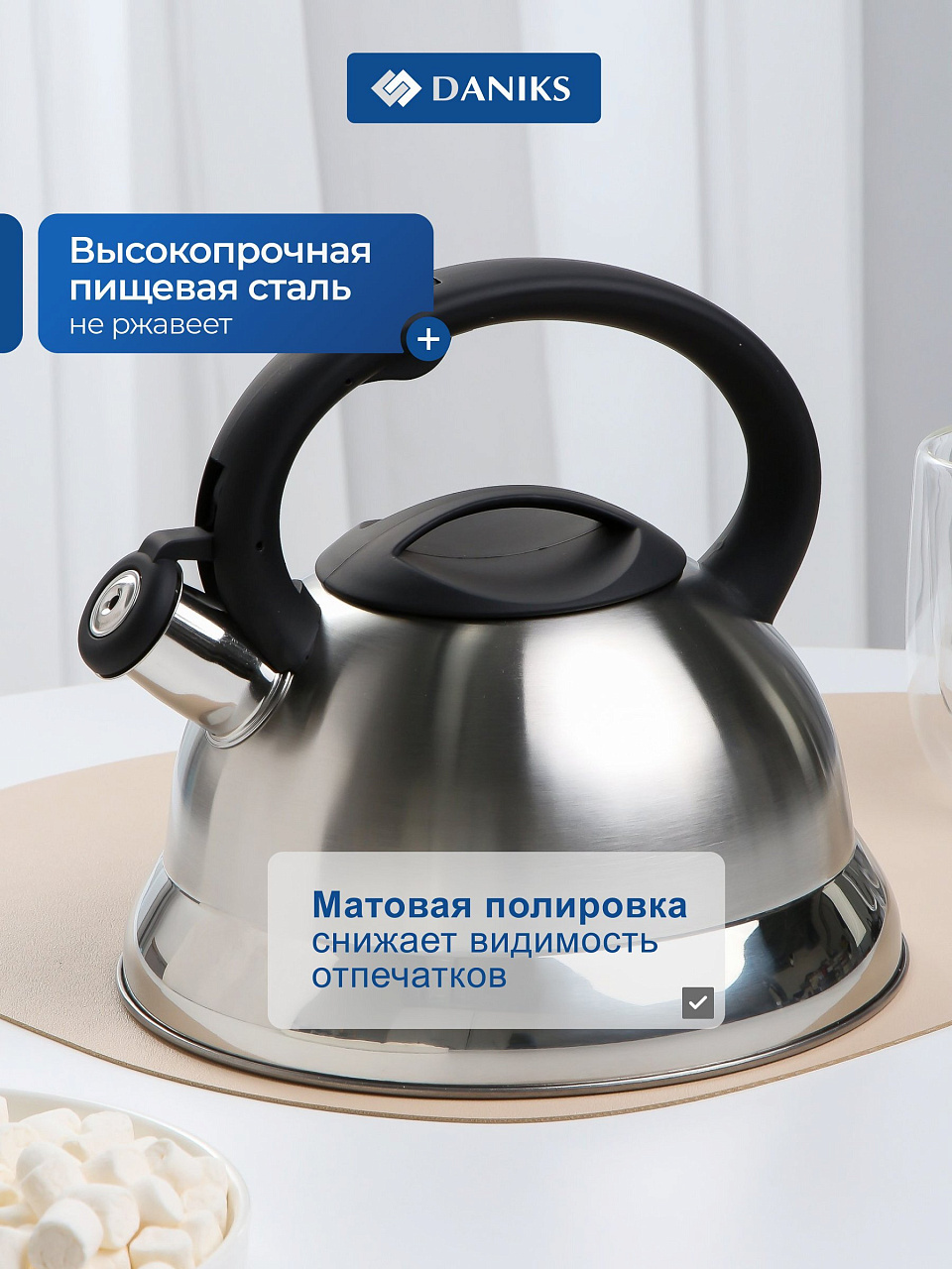 Свисток сигнализирует о закипании, что удобно при работе на кухне или если вы заняты другими делами. Матовая нержавеющая сталь не требует сложного ухода, а силиконовая ручка защищает от ожогов.