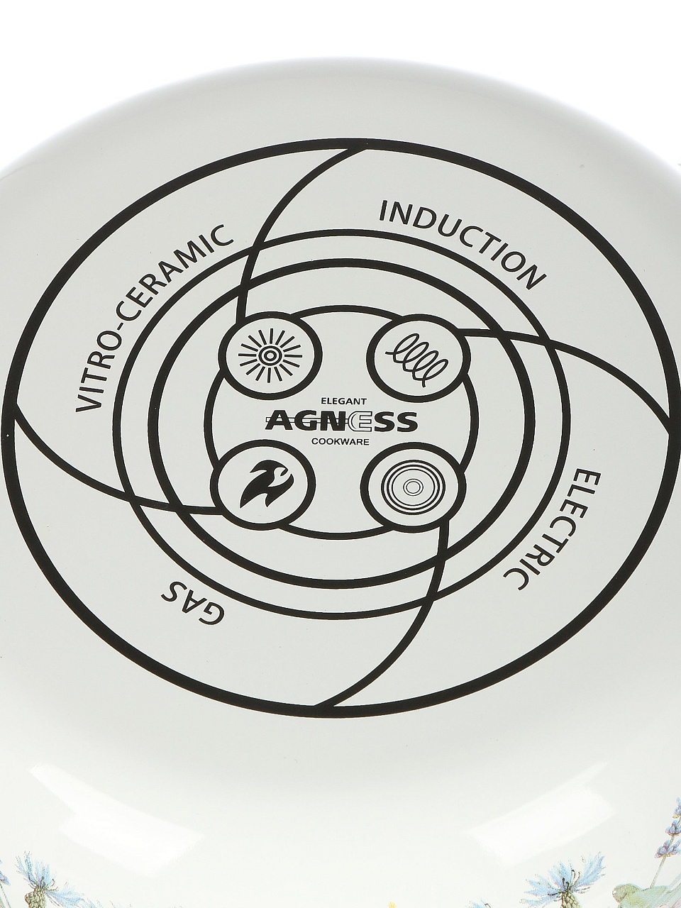 Да, чайник Agness "Дворцовый парк" подходит для индукционных, газовых, электрических и стеклокерамических плит. Диаметр дна — 15 см, материал — сталь с эмалью.