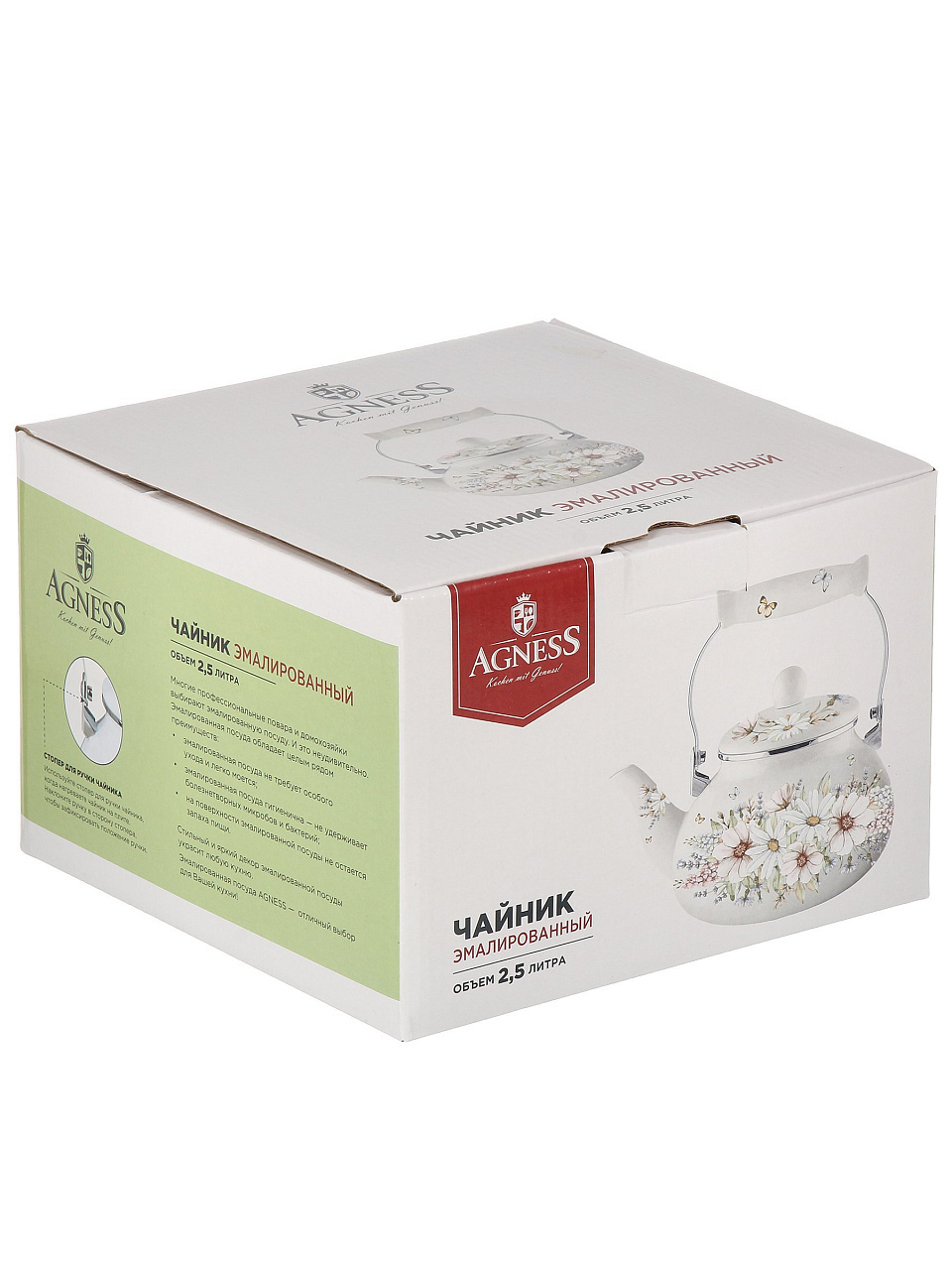Чайник Agness "Дворцовый парк" на 2.5 литра — это сочетание надежности и элегантного дизайна. Эмалированное покрытие защищает сталь от ржавчины и облегчает уход: его можно мыть в посудомоечной машине. Благодаря диаметру дна 15 см и однослойной конструкции чайник быстро нагревается, экономя время на кухне. Часто спрашивают, подходит ли этот чайник для индукционных плит — да, он полностью совместим с индукцией, а также с газовыми, электрическими и стеклокерамическими плитами.