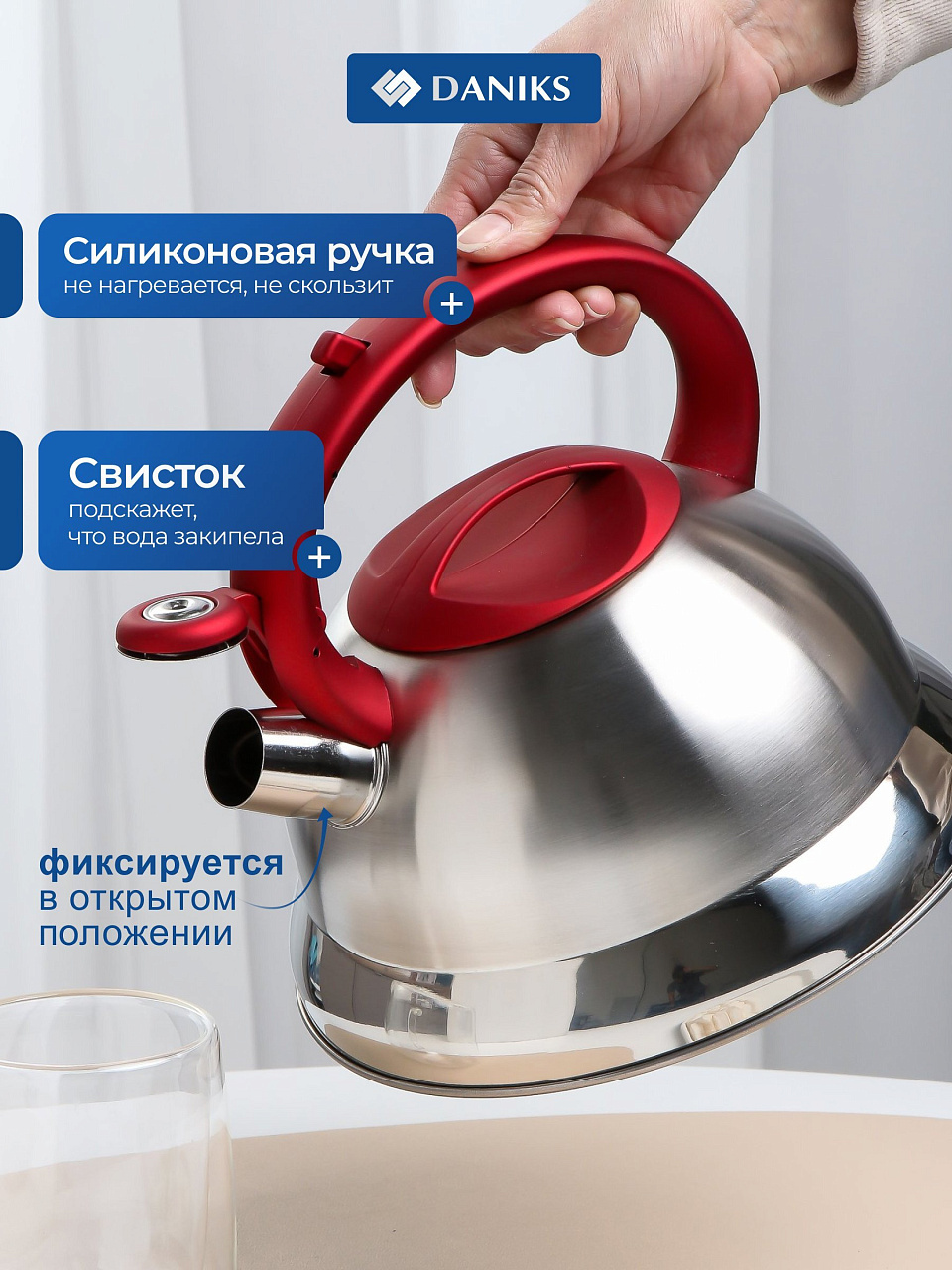 Покупатели часто спрашивают: подходит ли этот чайник для индукционной плиты? Нет, он совместим только с газовыми, электрическими и стеклокерамическими плитами. В отличие от эмалированных моделей, нержавеющая сталь не подвержена сколам, не впитывает запахи и легко моется даже в посудомоечной машине. Если вы выбираете чайник для дачи или подарка, обратите внимание на универсальный дизайн и практичность — Daniks отлично впишется в любой интерьер.