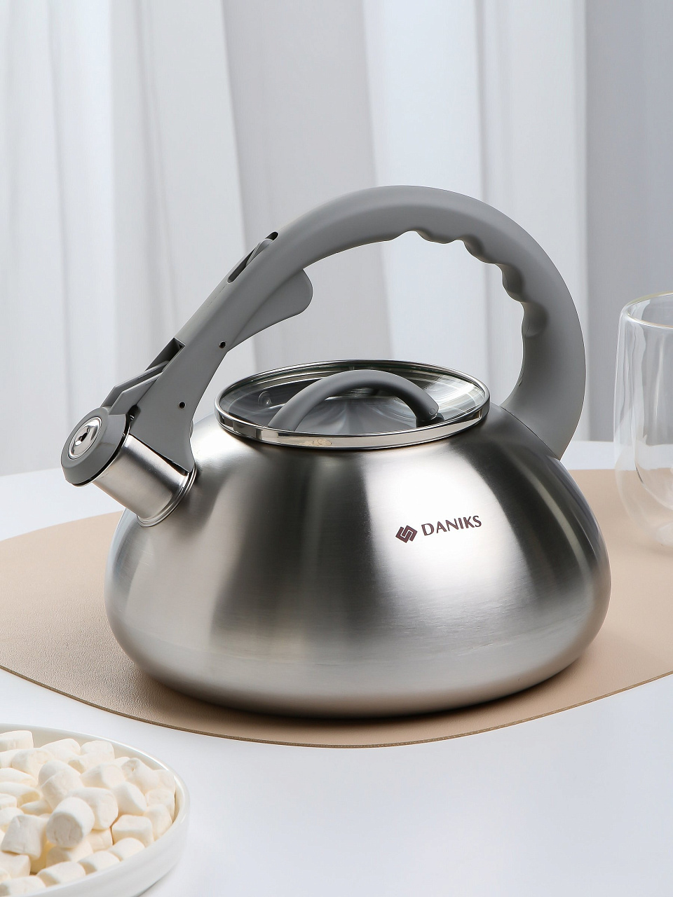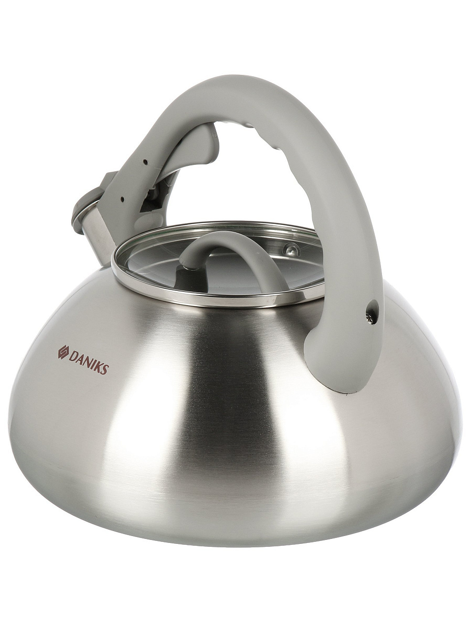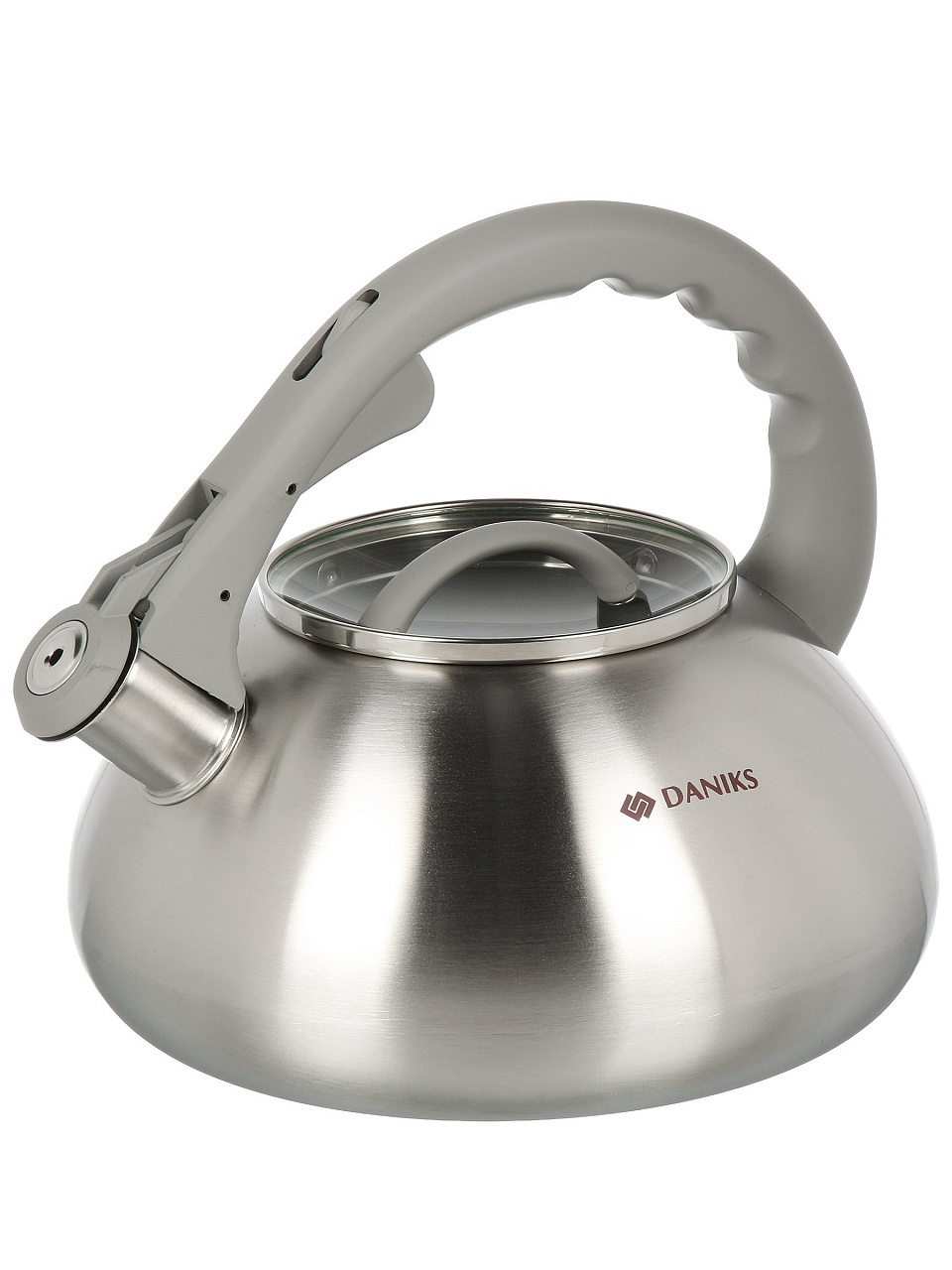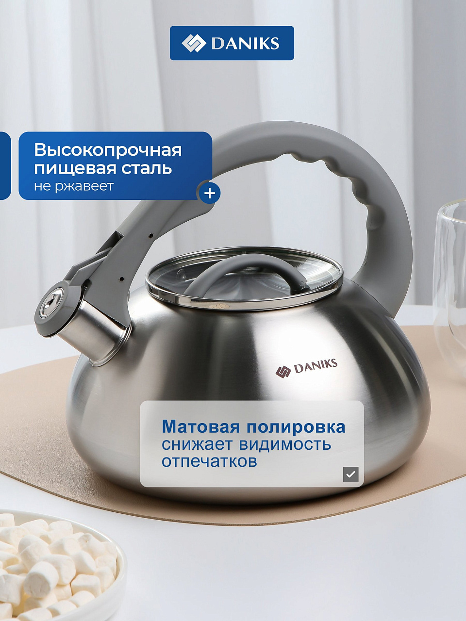 Чайник Daniks DSC-8801 из нержавеющей стали 3 л — матовый корпус, свисток, ручка с силиконовым покрытием и логотипом, который меняет цвет. Идеален для дома и дачи, не перегревается и легко очищается.