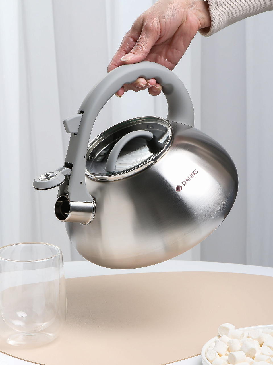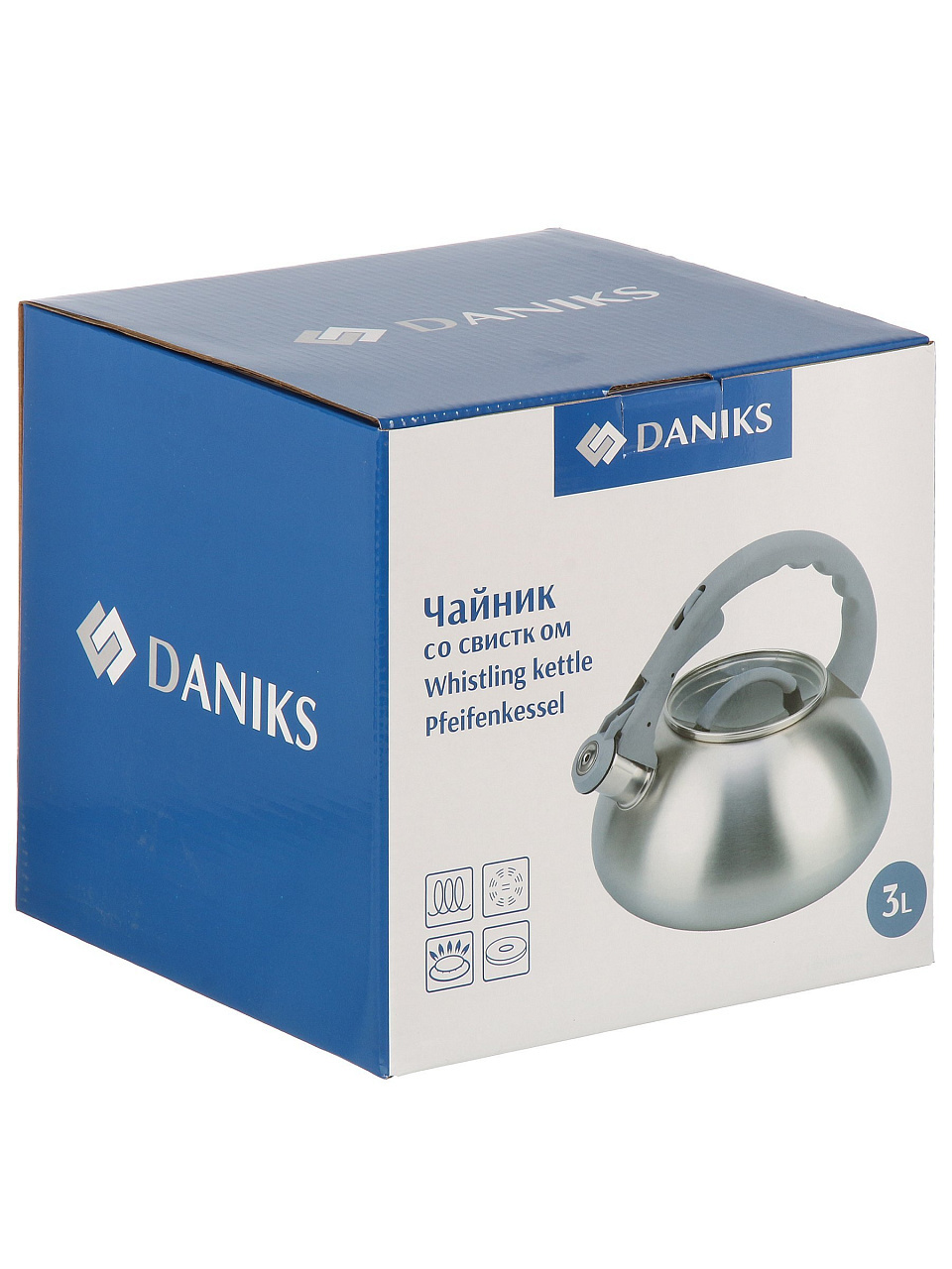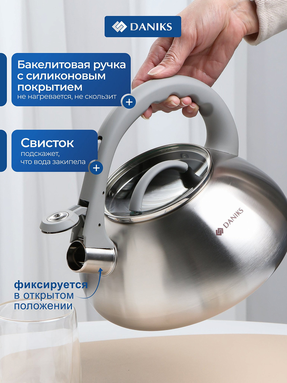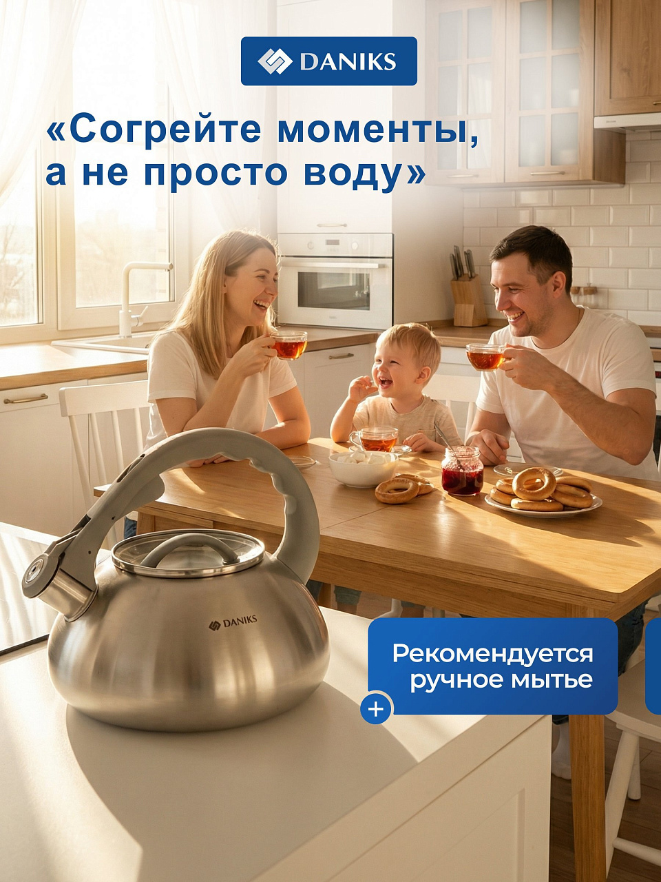 Как использовать чайник Daniks? Просто налейте воду, поставьте на плиту, дождитесь изменения цвета логотипа и сигнала свистка. Благодаря матовой стали и эргономичной ручке, чайник удобно держать, даже если он только что снят с огня. Если вы ищете, что лучше для большой семьи или для частых чаепитий, этот объемный чайник — оптимальный выбор.