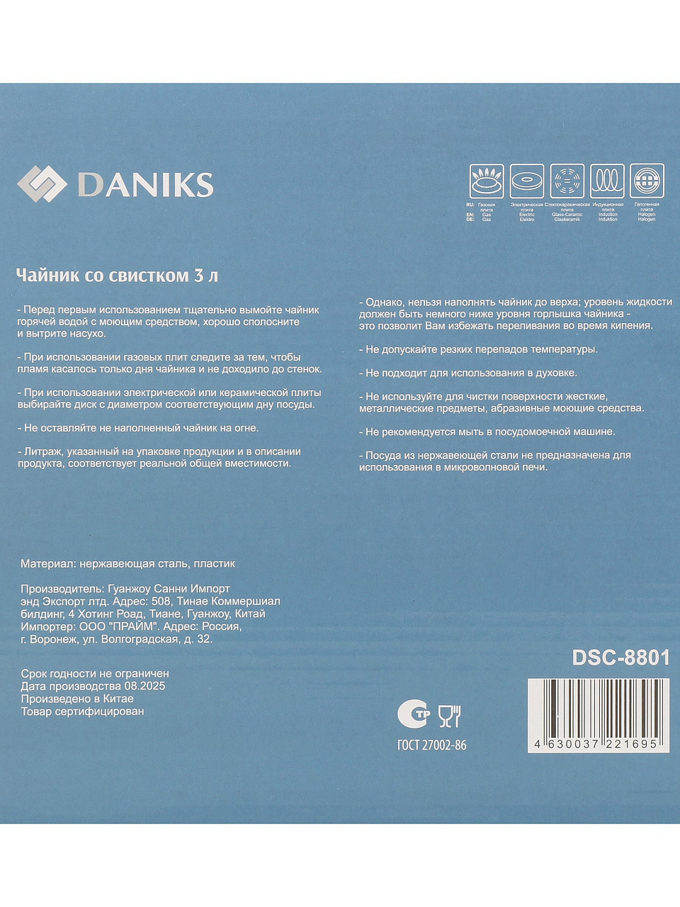 Нет, чайник Daniks DSC-8801 не подходит для индукционных плит — он предназначен для газовых, электрических и стеклокерамических поверхностей.