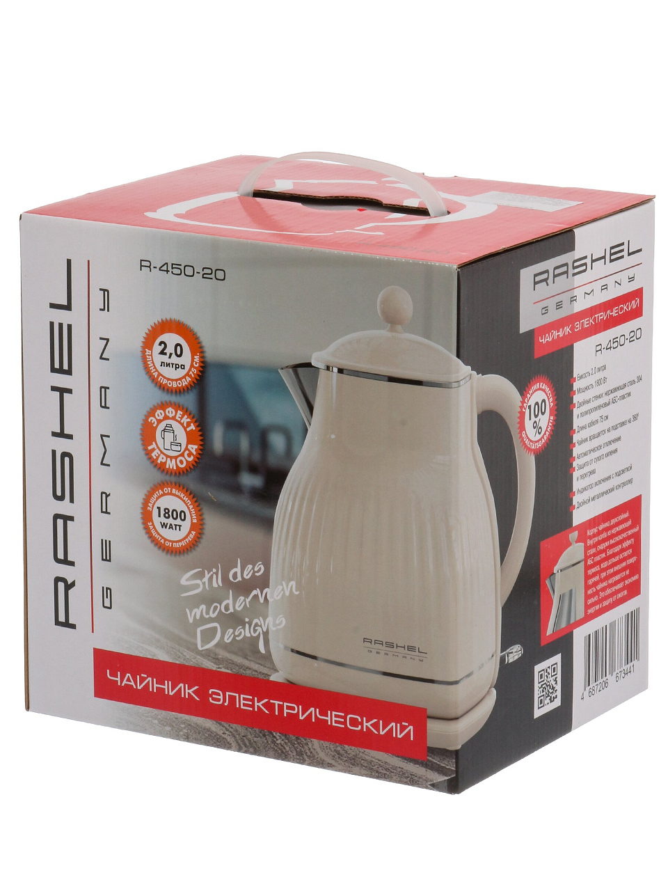 Электрический чайник RASHEL R-450-20: стильный дизайн, 2 литра объема и мощность 1800 Вт для быстрого кипячения воды дома или на даче.