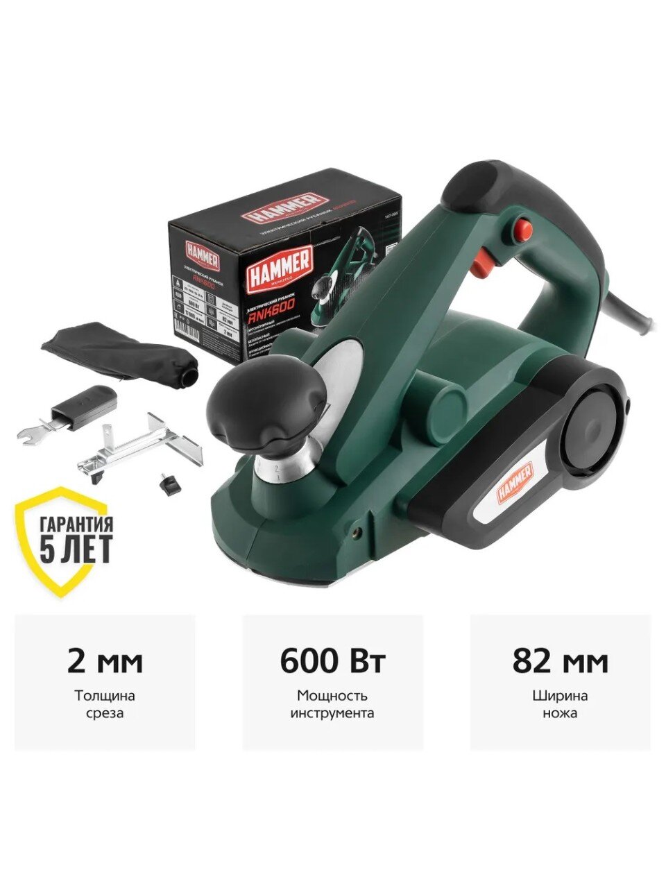 Электрорубанок Hammerflex RNK600, предназначен для выравнивания поверхности, снятия фаски под разными углами или выстругивания пластин. Модель располагает узкой подошвой в 82 мм и поворотным регулятором глубины строгания, максимальная величина которого достигает 2 мм. При желании к рубанку Hammerflex RNK600 можно подключить строительный пылесос, который не оставит мусора в помещении. Прибор эргономичен и сбалансирован, поэтому долгое время не утомляет руки.