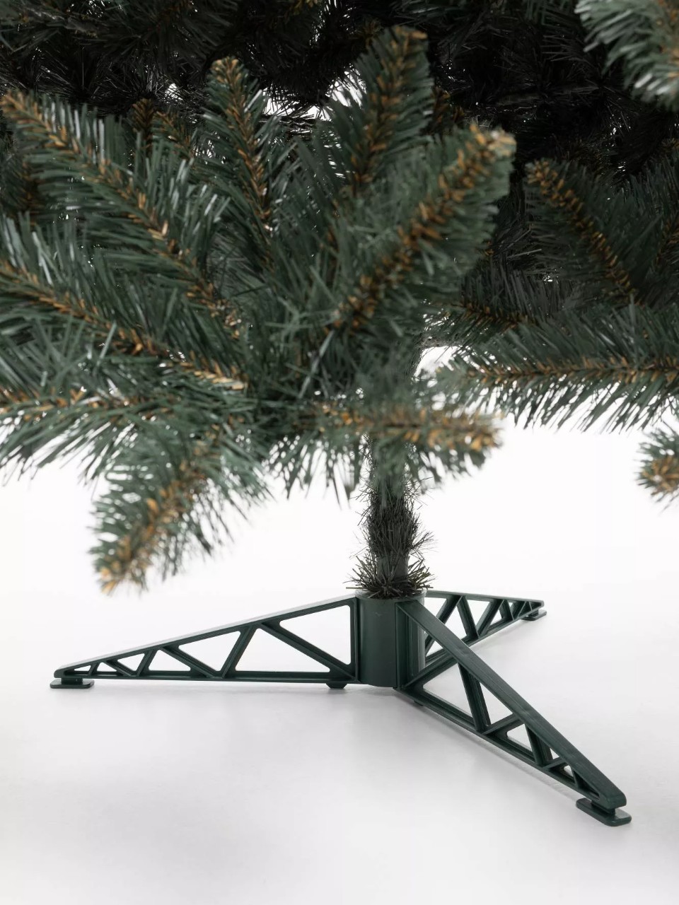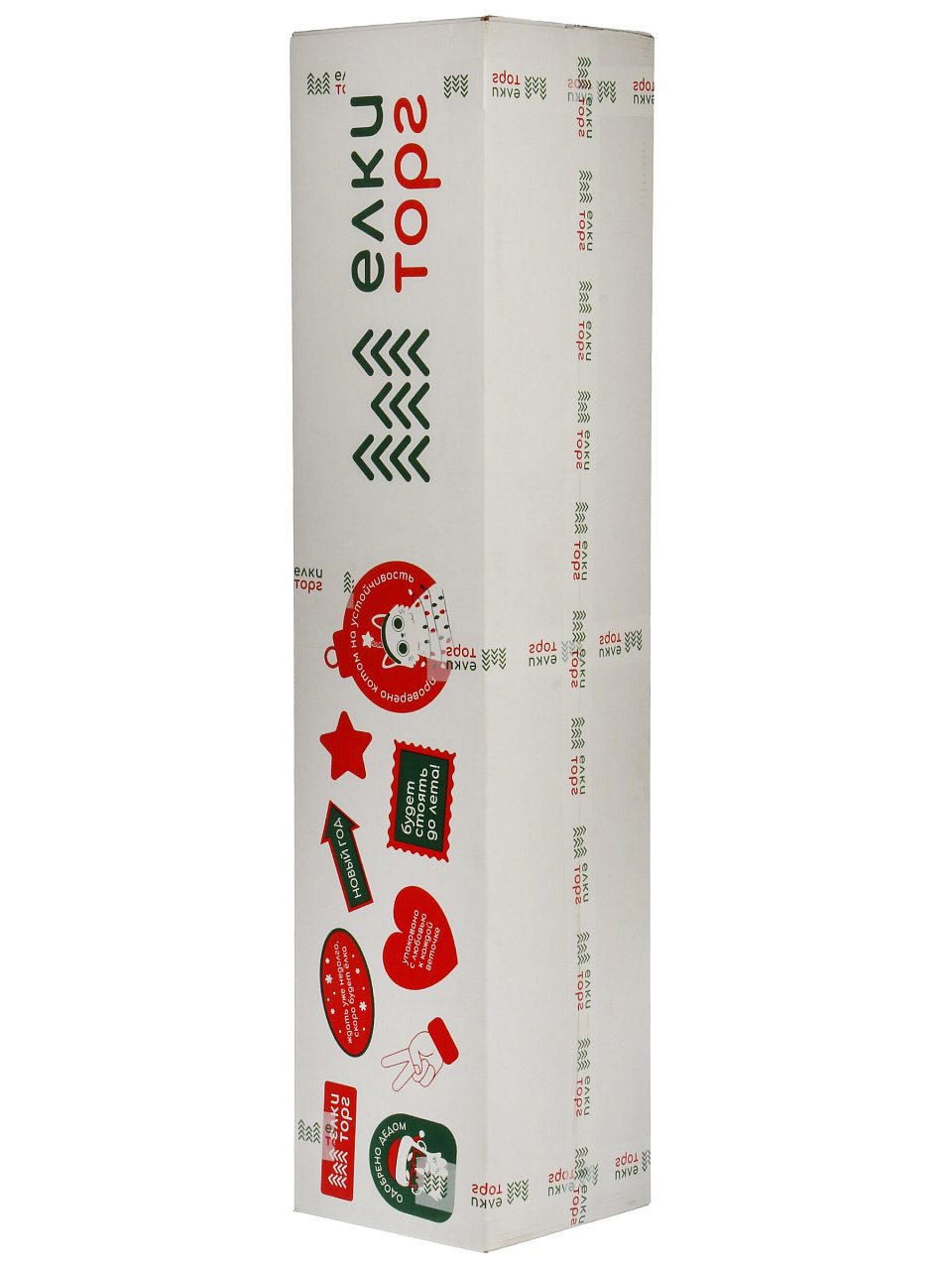 Высота елки — 180 см, диаметр — 108 см, конструкция ствольная, сборка занимает 10–15 минут благодаря шарнирному креплению веток, подставка пластиковая включена в комплект.
