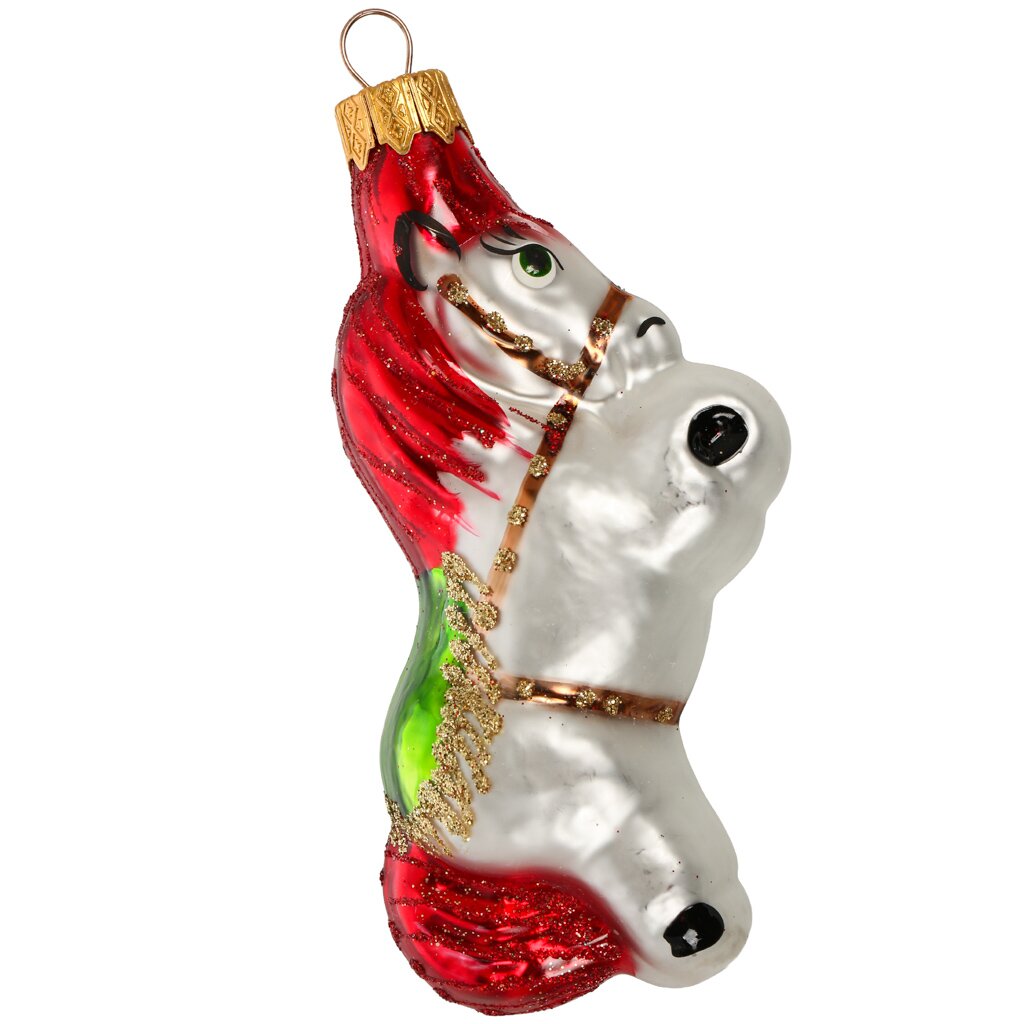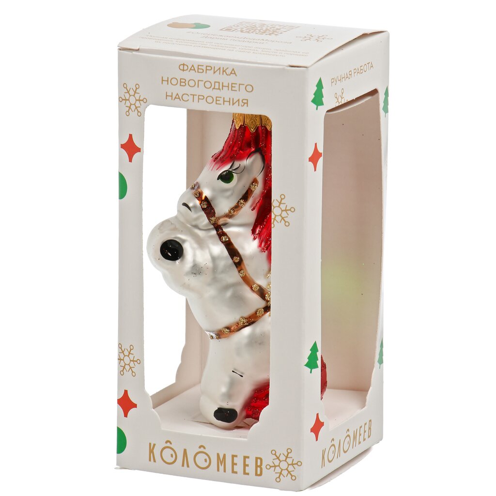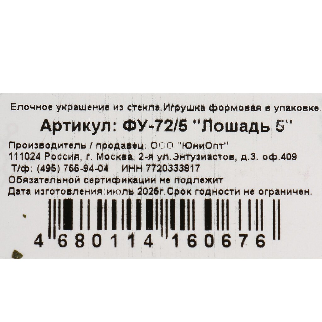 Елочное украшение Лошадь 5 из стекла — стильный акцент для новогодней елки. Безопасная упаковка, размер 10 см, универсальный подарок для дома и дачи.