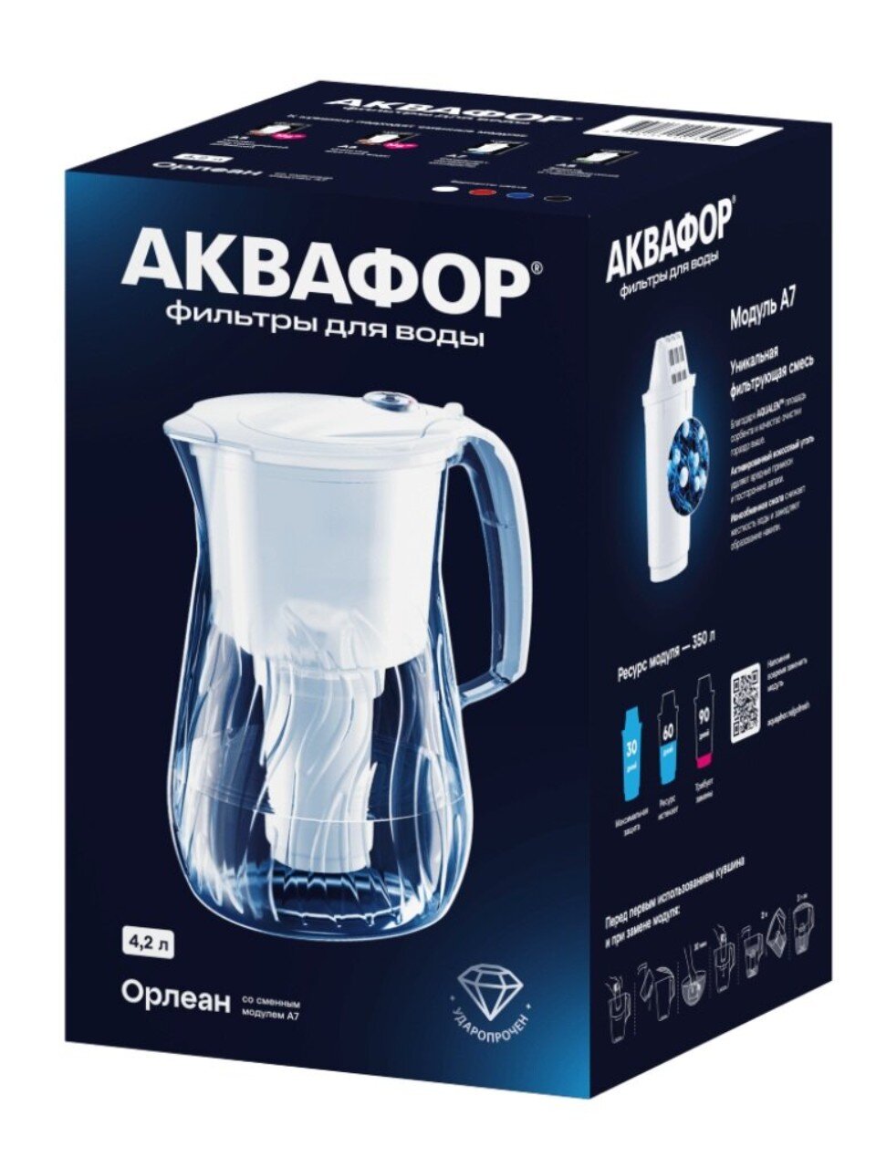 Изящный дизайн кувшина Орлеан сочетается с его большим ресурсом 350 литров и способностью глубоко очистить воду от вредных примесей, посторонних привкусов и запахов.