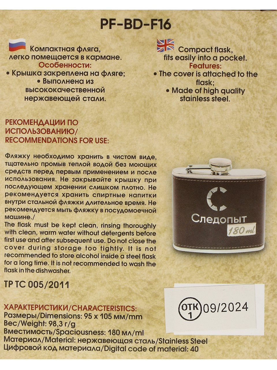 - Долговечность: нержавеющая сталь устойчива к коррозии, объём 0,18 л — оптимальный для кармана или рюкзака