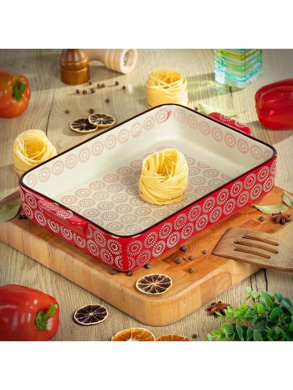 Керамическая форма для запекания 35×24.5×6.5 см — это выбор тех, кто ценит эстетику и практичность на кухне. Благодаря жаропрочному материалу, форма выдерживает высокие температуры в духовке, обеспечивая равномерное пропекание без пригорания. Если вы ищете, какую форму для запекания выбрать для семьи или гостей, обратите внимание на вместимость 3 литра: этого достаточно для запеканок, курицы, пирогов или порционных кексов. Яркий красный цвет и оригинальный рисунок «Круги» делают эту форму эффектным элементом сервировки, что особенно актуально для праздничных ужинов и подарков.