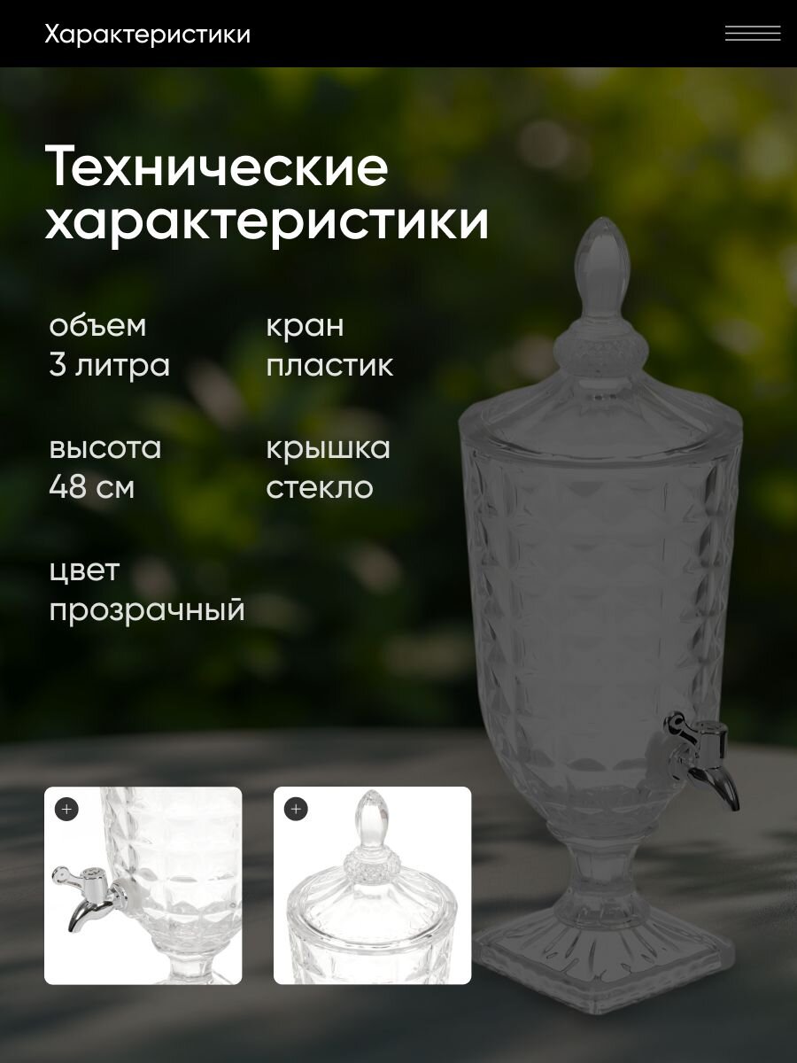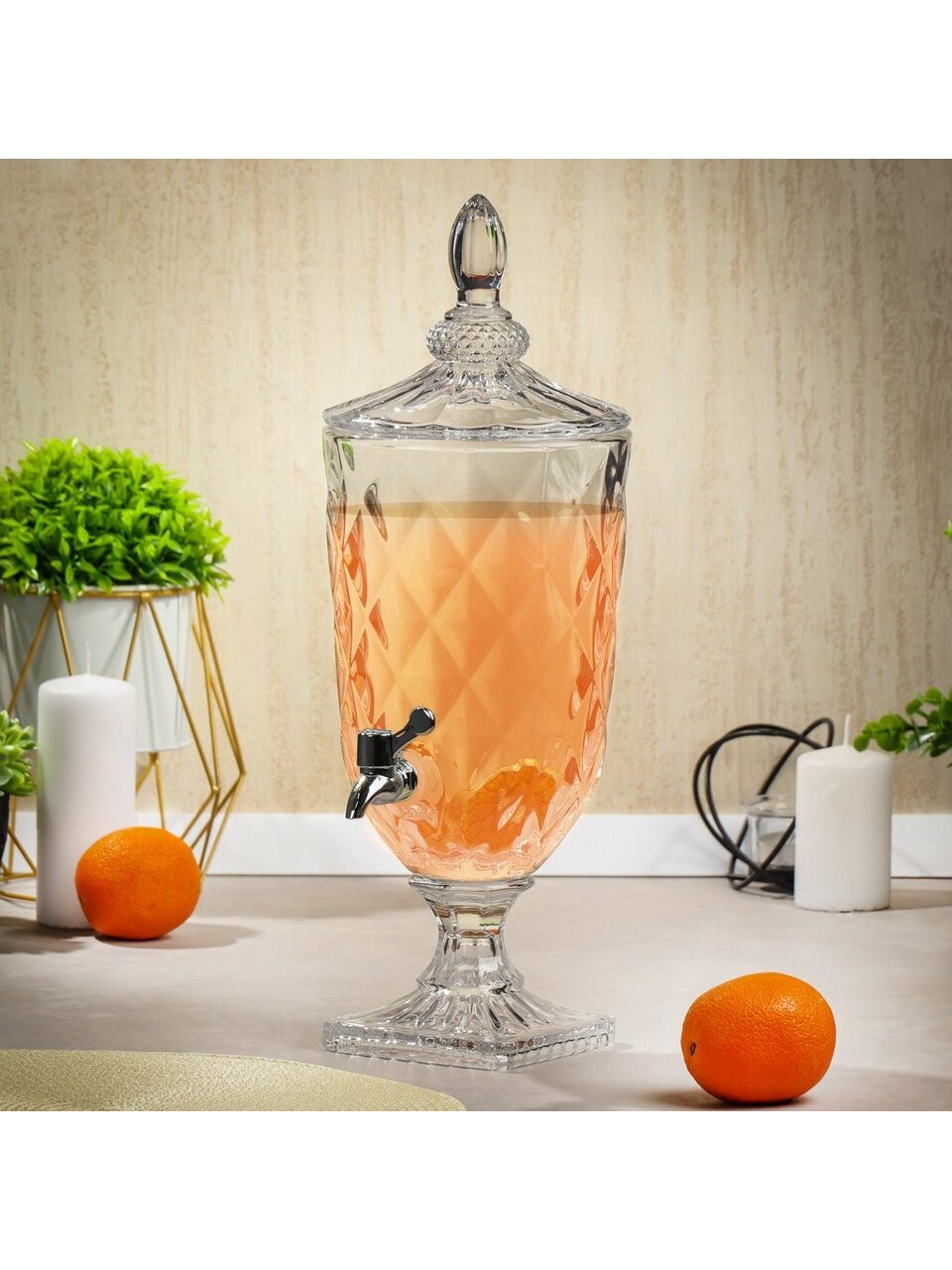 Диспенсер для напитков "Лимонадница" представляет из себя классический графин для холодных напитков с удобным краном. Выполненная из высококачественного стекла и украшенная красивым рельефным узором, емкость оснащена закрывающейся стеклянной крышкой, которая не позволит выдохнуться аромату Ваших напитков. Элегантный дизайн изделия украсит собой любой праздничный стол, в таком диспенсере Вы сможете подать вино, морс, различные наливки и ликеры, цвет которых будет играть, преломляясь через рельефные внешние грани сосуда.