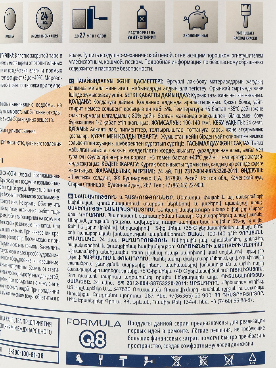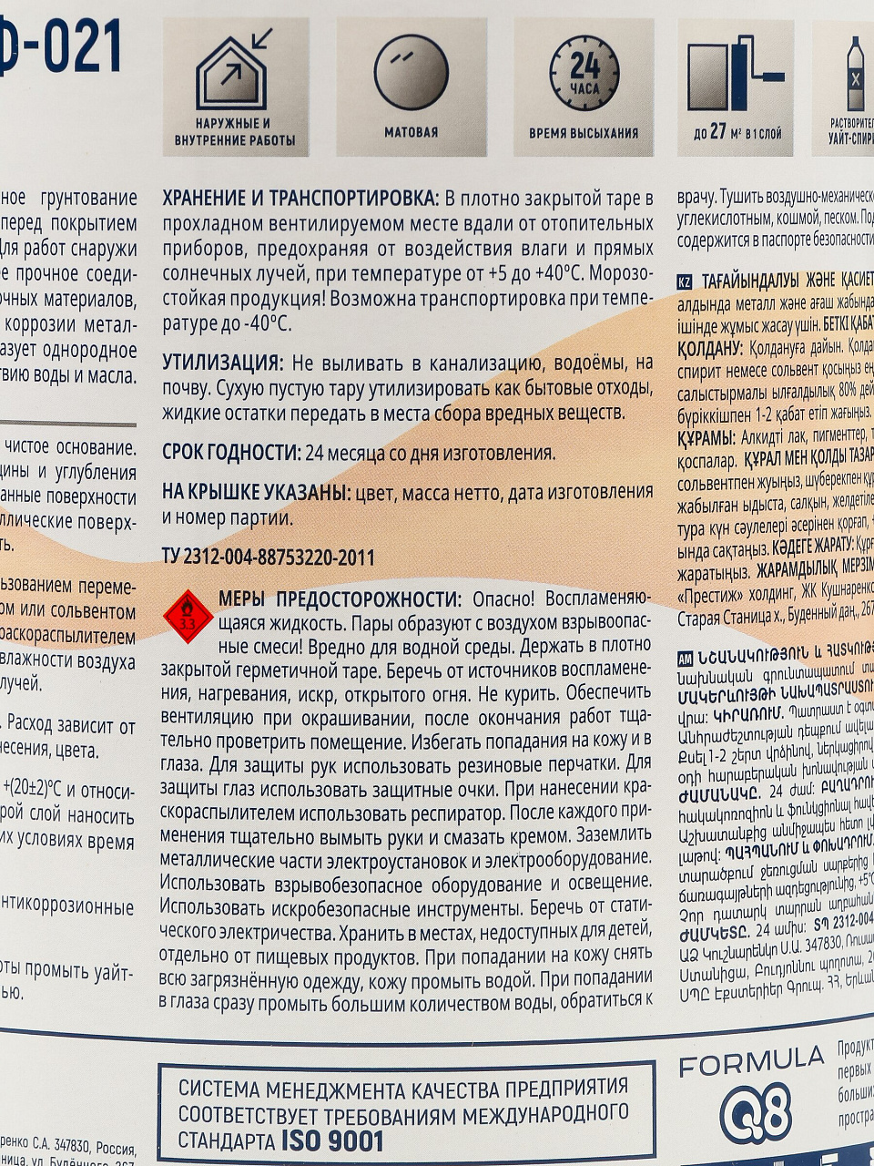 - Высокая адгезия и антикоррозийная защита — грунтовка Formula Q8 ГФ-021 обеспечивает прочное сцепление с поверхностью и предотвращает ржавчину.