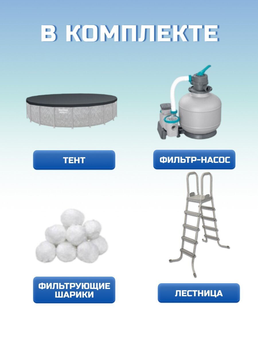 Бассейн Bestway оснащен всеми необходимыми элементами для удобства и безопасности использования. В комплект входит фильтр-насос производительностью 8327 литров, который поддерживает чистоту воды, лестница из оцинкованной стали для легкого доступа, и тент, защищающий бассейн от загрязнений. Полисферы, входящие в комплект, являются инновационным решением для фильтрации, заменяя традиционный песок и обеспечивая легкость в уходе.