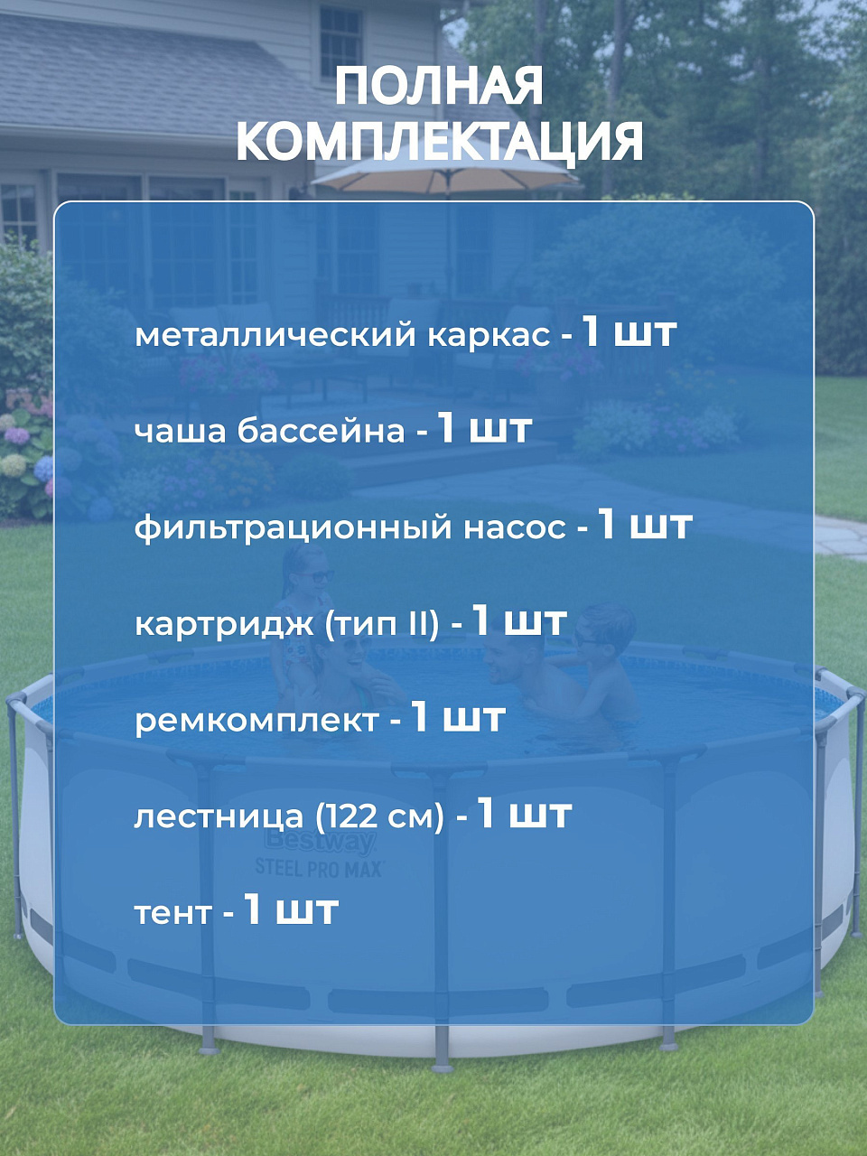 - В комплекте идет фильтр-насос с производительностью 3028 л/ч, обеспечивающий чистоту воды.