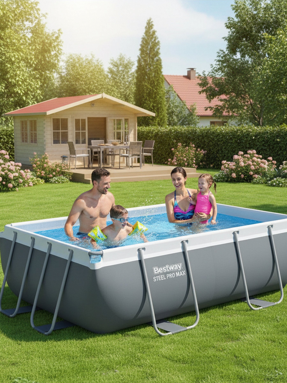 Модель Bestway Power Steel 282×196×84 см — это средний размер, подходящий для участка 4×3 м. Глубина 84 см позволяет безопасно купаться детям и взрослым.