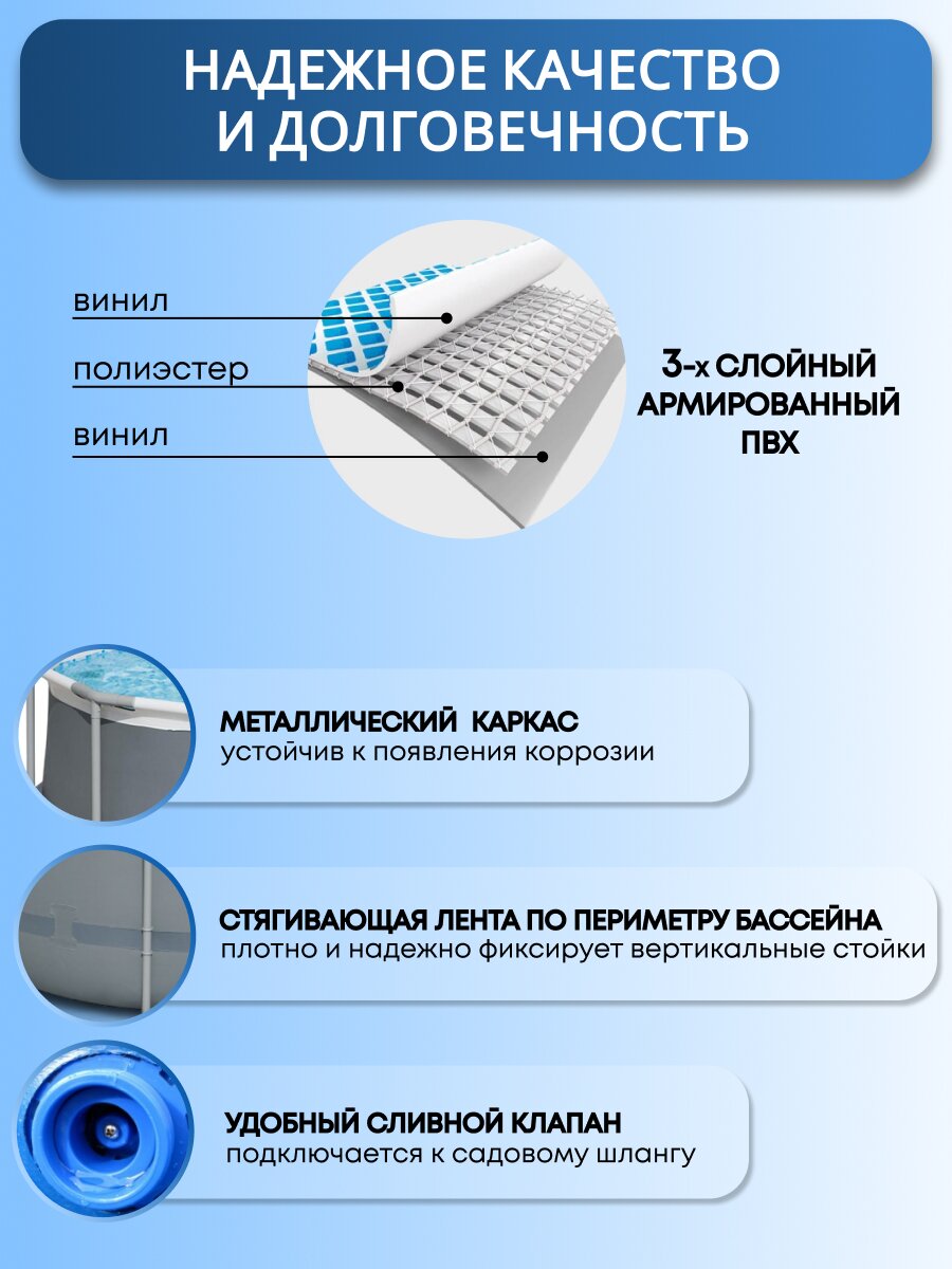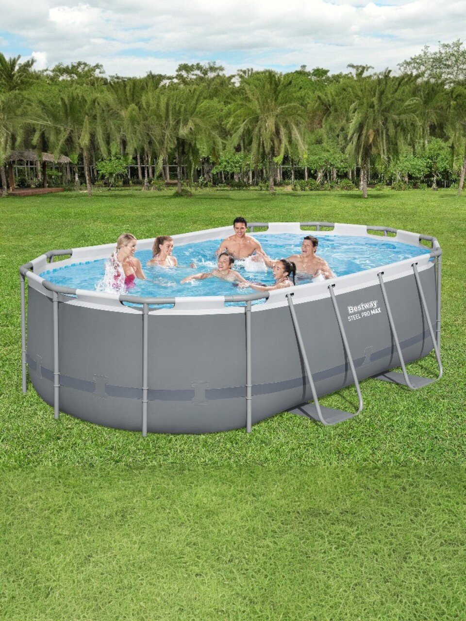 Если вы спрашиваете, подходит ли этот бассейн для детей, — да, бортик 100 см обеспечивает безопасность, а овальная форма удобна для игр и плавания. Как выбрать размер каркасного бассейна? Для семьи из 3-5 человек данный вариант — оптимальный компромисс между вместимостью и простотой монтажа.
