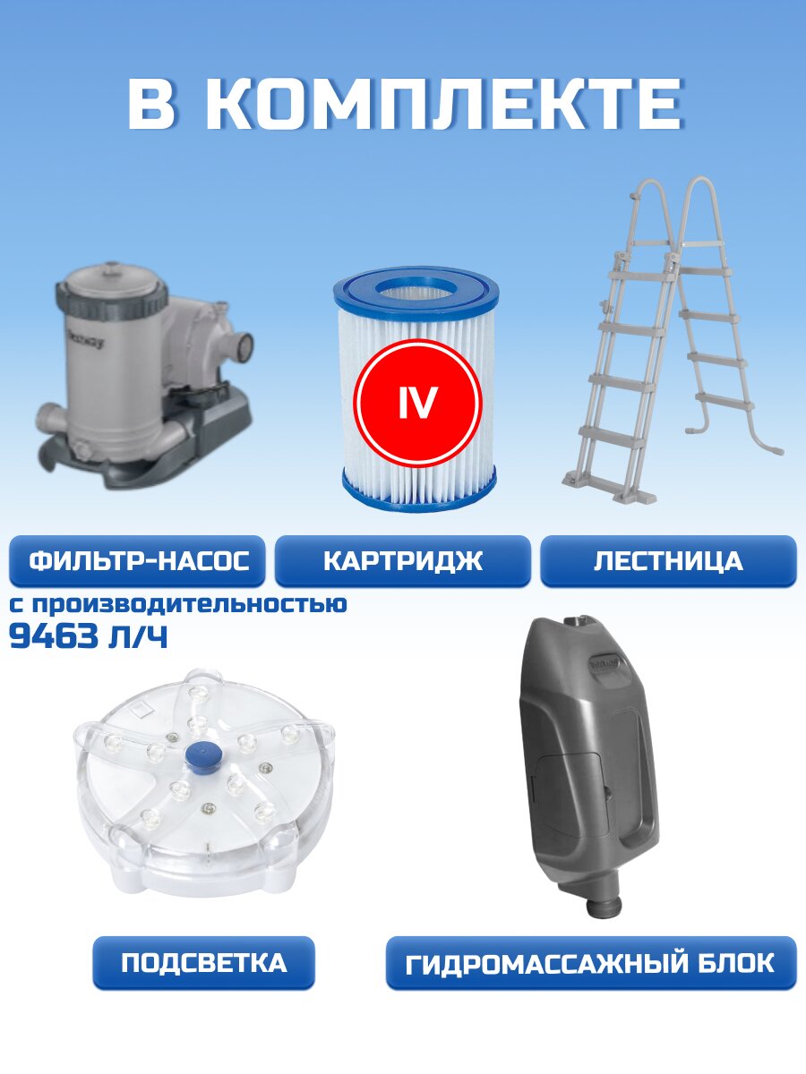 - Эффективная фильтрация: картриджный фильтр с производительностью 9463 л/ч поддерживает чистоту и прозрачность воды.