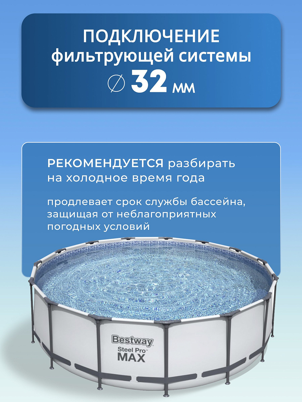 - Бассейн каркасный с прочной конструкцией из стали и ПВХ.