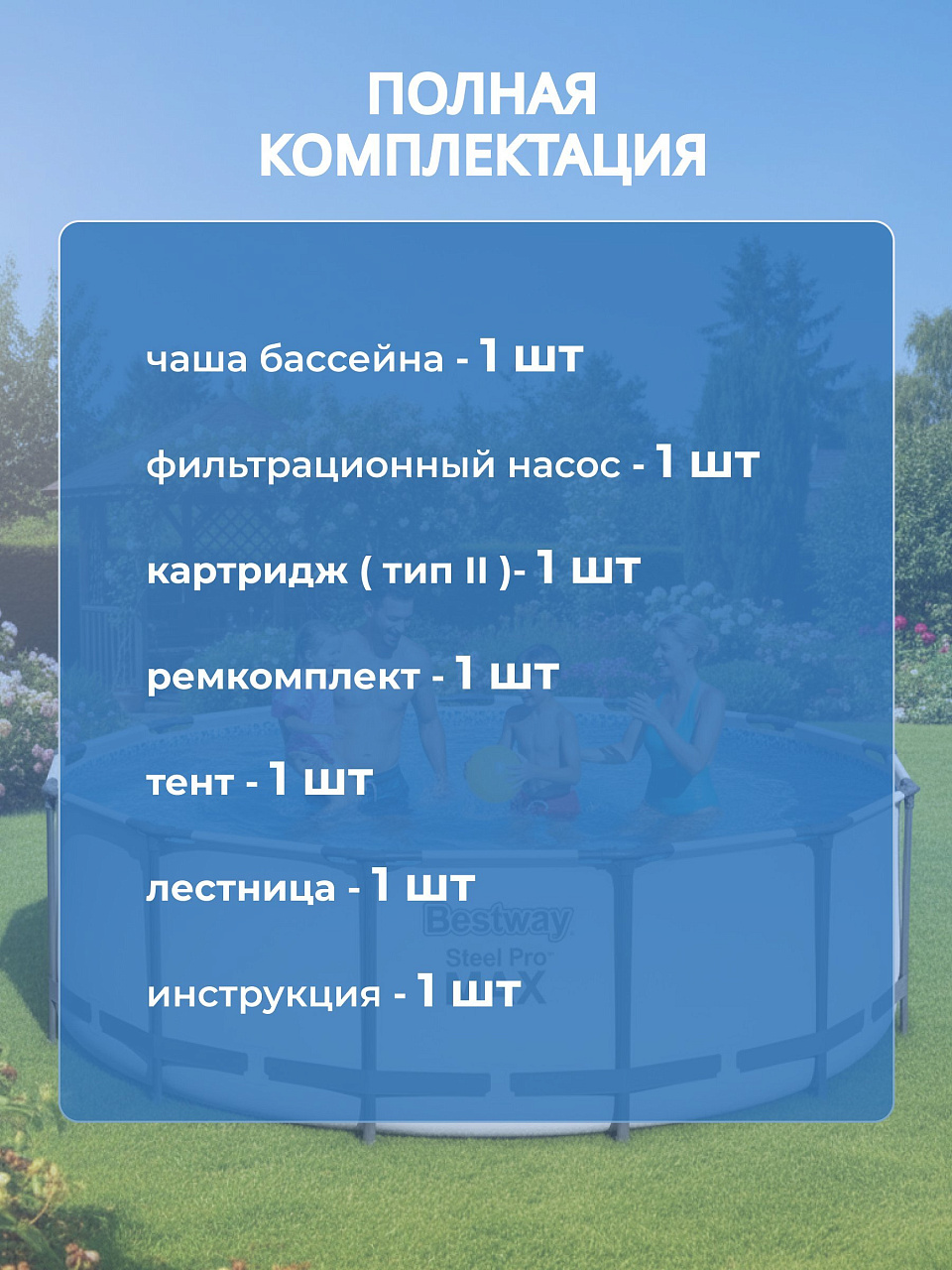 Выбирая бассейн Bestway, вы получаете не только высокое качество и надежность, но и возможность создать собственный уголок отдыха прямо у себя на участке. Это инвестиция в комфорт и здоровье, ведь плавание укрепляет мышцы и улучшает общее самочувствие. Подарите себе и близким незабываемые моменты радости и расслабления с бассейном Bestway Steel Pro Max!