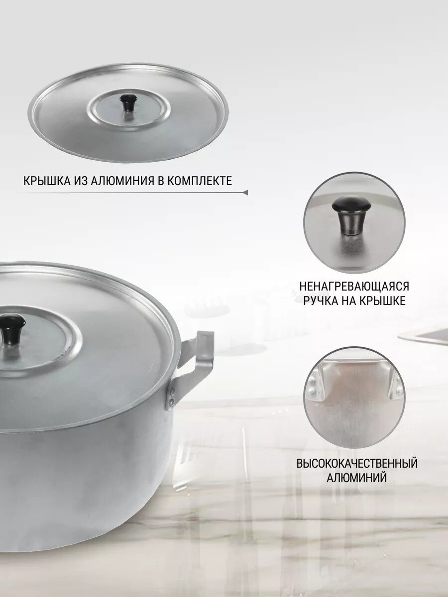 Если вы задаетесь вопросом, какую кастрюлю выбрать для большой семьи или для заготовок на даче, обратите внимание на этот вариант: вместимость 6 литров, совместимость с газовыми, электрическими и стеклокерамическими плитами, возможность мытья в посудомоечной машине. В отличие от аналогов из нержавейки или с антипригарным покрытием, алюминиевая кастрюля легче и быстрее остывает, не требует сложного ухода, а цена остается доступной.