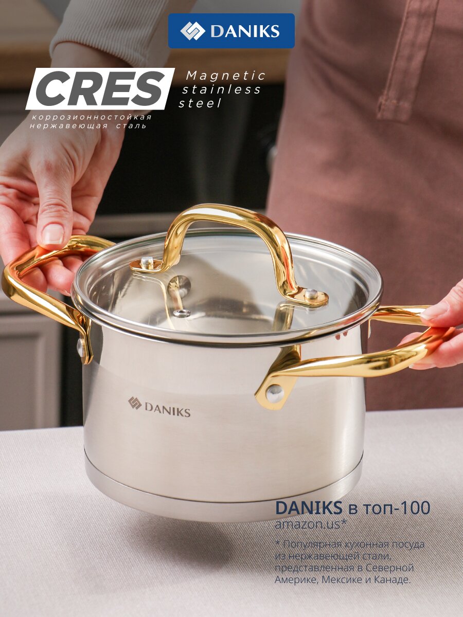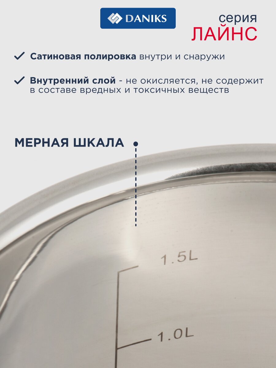 Кастрюля Daniks Лайнс 1.9 л — универсальное решение для дома и дачи: прочная нержавеющая сталь, капсульное дно, стеклянная крышка, подходит для индукции и всех типов плит.