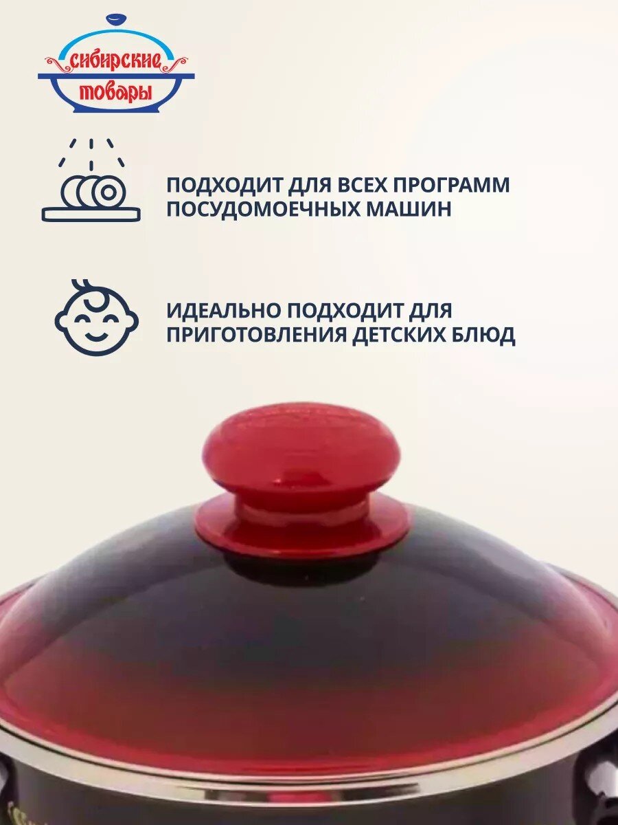 Эмалированная кастрюля объёмом 2 литра из коллекции «Сибирские товары Рябинушка» — это оптимальный выбор, если вы ищете, какую кастрюлю купить для индукционной плиты или универсальную посуду для разных типов плит. Благодаря цилиндрической форме и плоскому дну (толщина 0,8 мм), кастрюля равномерно прогревает суп, кашу, макароны или пельмени. Стальное основание с эмалированным покрытием гарантирует устойчивость к царапинам и коррозии, а отсутствие антипригарного слоя делает изделие безопасным для здоровья.