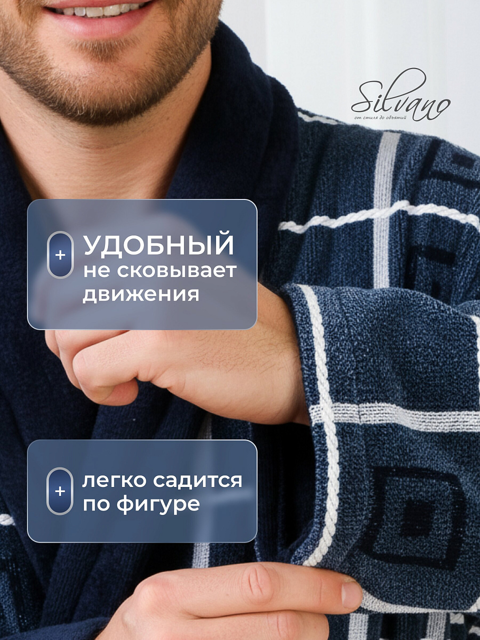 Мужской халат Silvano из махрового хлопка — это оптимальный выбор для тех, кто ищет, какой халат лучше для ежедневного использования дома или на даче. Благодаря натуральному составу (100% хлопок) халат не вызывает раздражения, отлично впитывает влагу после душа и быстро сохнет. Синий цвет в клетку выглядит современно и не теряет яркости даже после многократных стирок.