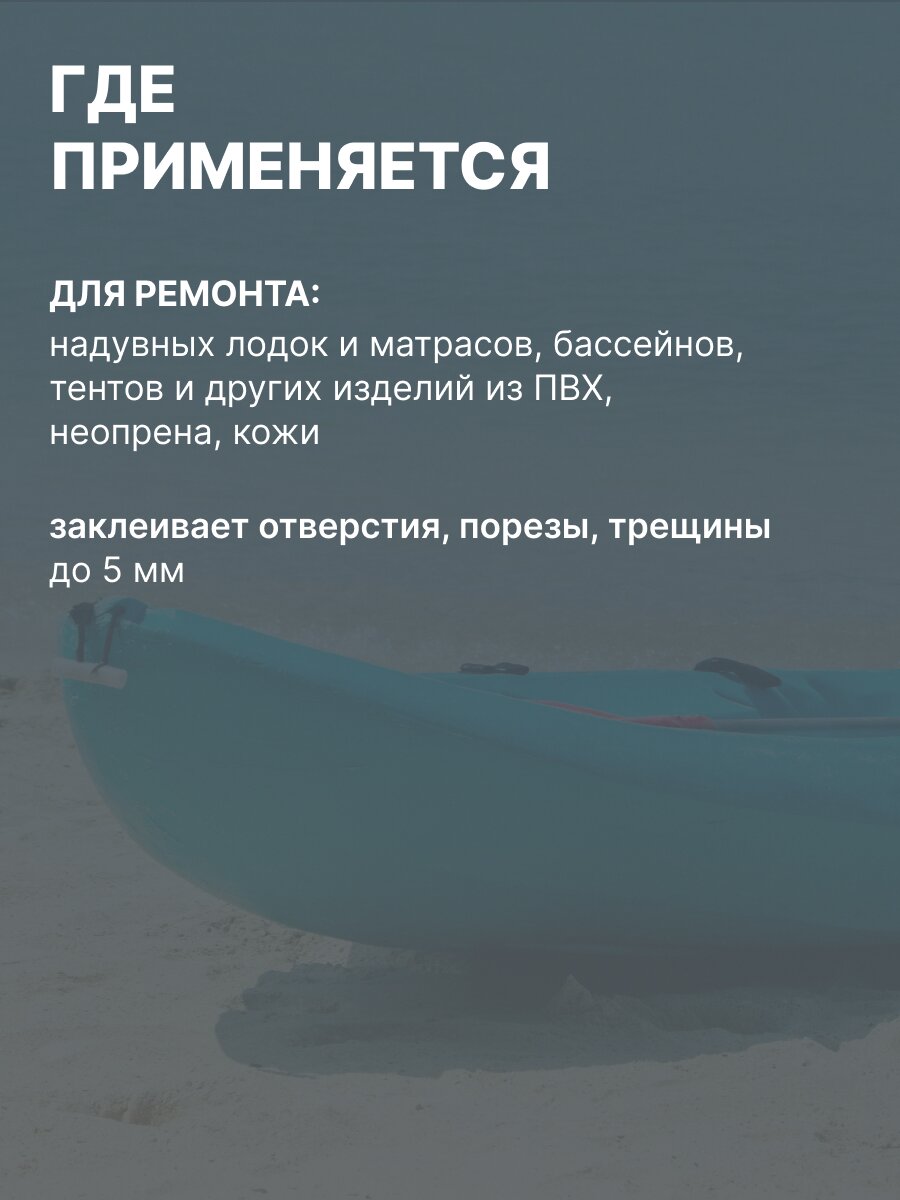 Заплатка жидкая предназначена для ремонта надувных лодок и матрасов, бассейнов, сапог, тентов и других изделий из ПВХ, неопрена, кожи. Позволяет заклеить отверстия до 5 мм, порезы, трещины.
