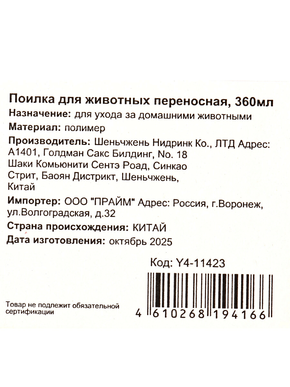 Переносная поилка для животных Y4-11423 — это современное решение для заботы о питомцах вне дома. Благодаря объёму 0,36 л и прочному полимеру, поилка не протекает, легко чистится и не занимает много места. Если вы ищете, какую поилку выбрать для прогулок или поездок, обратите внимание на компактность и герметичность — эта модель полностью отвечает этим требованиям.