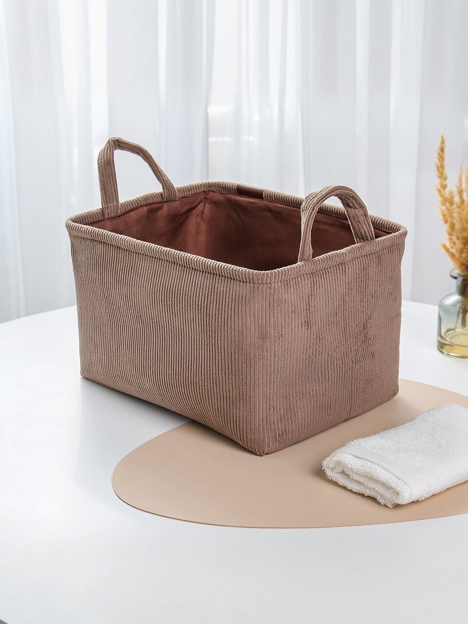 Корзина для хранения 34×24×19 см из коричневого вельвета с ручками: компактное решение для порядка дома и стильного декора, удобно складывается и переносится.