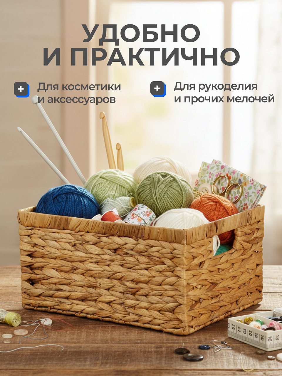 Корзина универсальна: она подходит для хранения продуктов, текстиля, мелких предметов, как элемент декора или оригинальная упаковка для подарка. Благодаря ручкам ее удобно перемещать между комнатами или брать с собой на дачу.